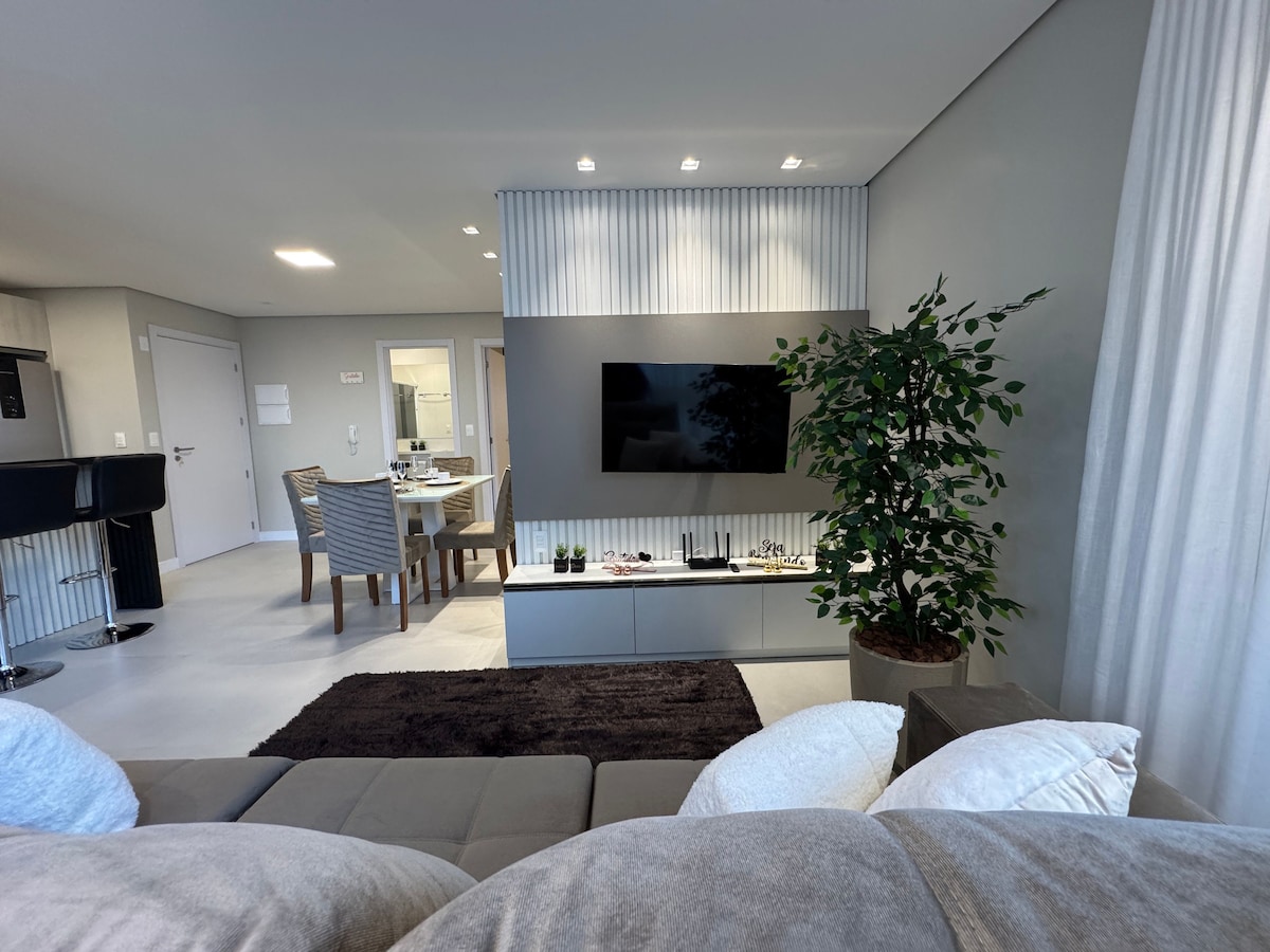 Modern apartment, very well equipped and extremely well located in the center of Torres, 2 blocks from Lagoa do Violão. 3 en-suites with air-conditioning, 2 with a double bed and 1 with 2 single beds, plus 1 toilet. Living room with SmartTV, Wi-Fi, Netflix, integrated dining with barbecue and fully equipped open kitchen. The apartment is 4 blocks from the beach and accommodates up to 8 guests, 6 adults and 2 children on a sofa and mattress. 2 parking spaces and beach chairs available.