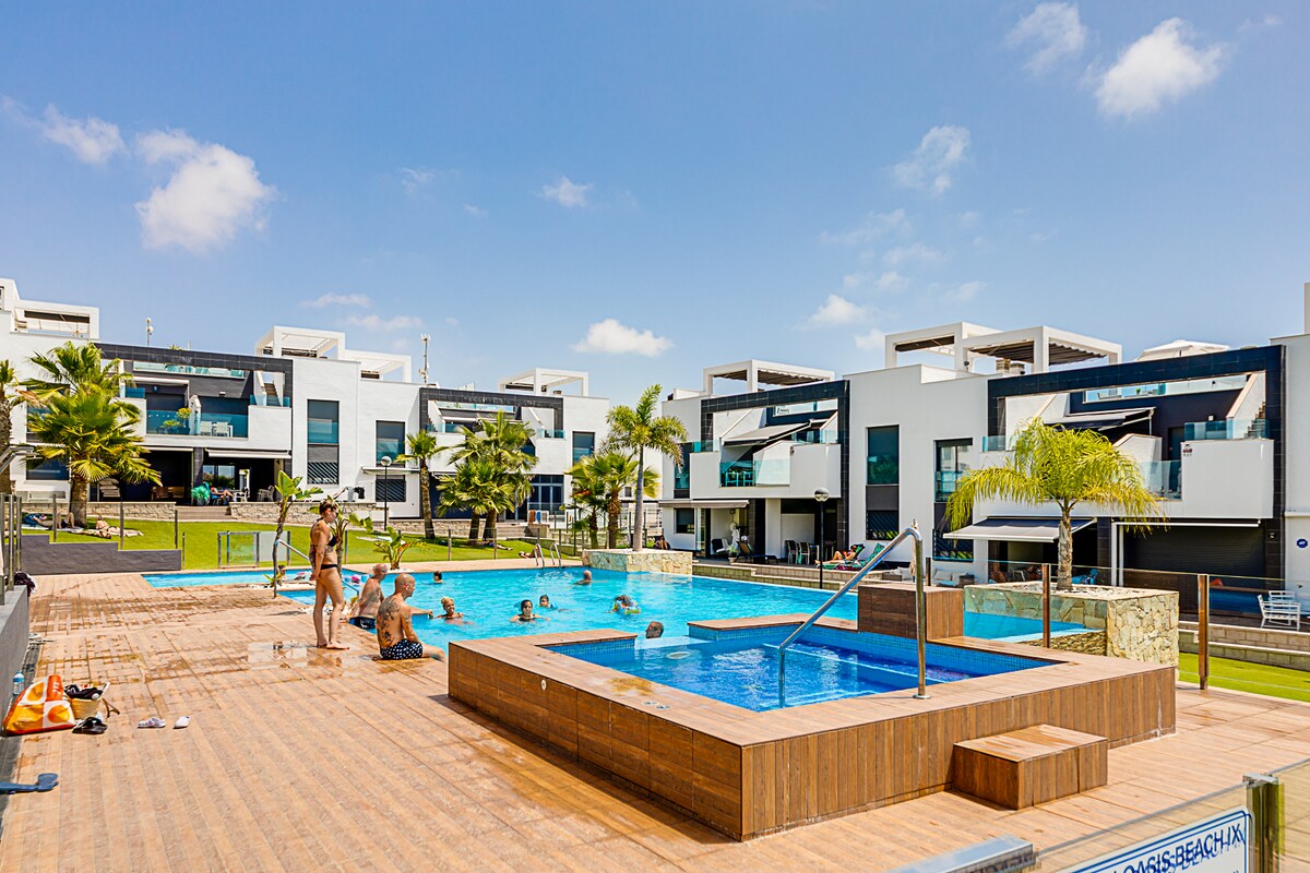 Beautiful and modern 2-bedroom ground floor bungalow is located in the famous area of Playas Higuericas, which stands out for its magnificent beach, restaurants for different tastes and a long promenade, which can be explored on foot or by bicycle, enjoying the views and the sea breeze You can also enjoy a huge common area with 2 swimming pools, outdoor gym, children's area etc...