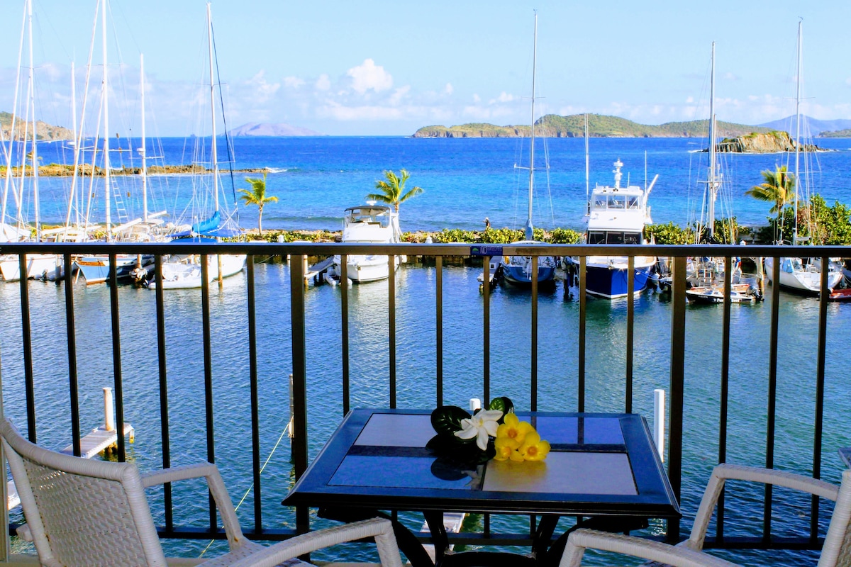 A waterfront, spacious luxury 1 BR/1 BA condo, sleeps 4, with full kitchen. Sip rum punches and watch island sunsets from the high granite bar on the full-length deck, all overlooking the azure waters of Cruz Bay and the marina. New listing in excellent condition with modern artwork and high-quality furniture, A/C, ceiling fans and tile floors. Spacious living/dining area with expansive waterfront views. Includes: beach chairs, cooler, etc. and 1 reserved covered parking space.