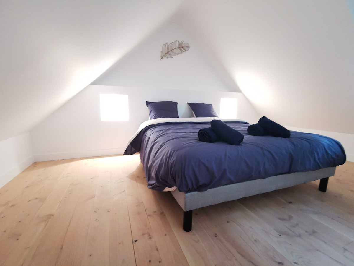 Your family will be close to everything when you stay at this centrally-located place. In the heart of the village (supermarket 50 m away), you will enjoy all the benefits of the countryside... the spacious and refined living room offers a cozy setting. On the ground floor, a king-size bed and its ensuite bathroom, living room and kitchen; upstairs, a bedroom with 2 electric beds 90 x 200, with its bathroom and office space... Parking, supermarket and charging station for electric vehicles 50 m away...
