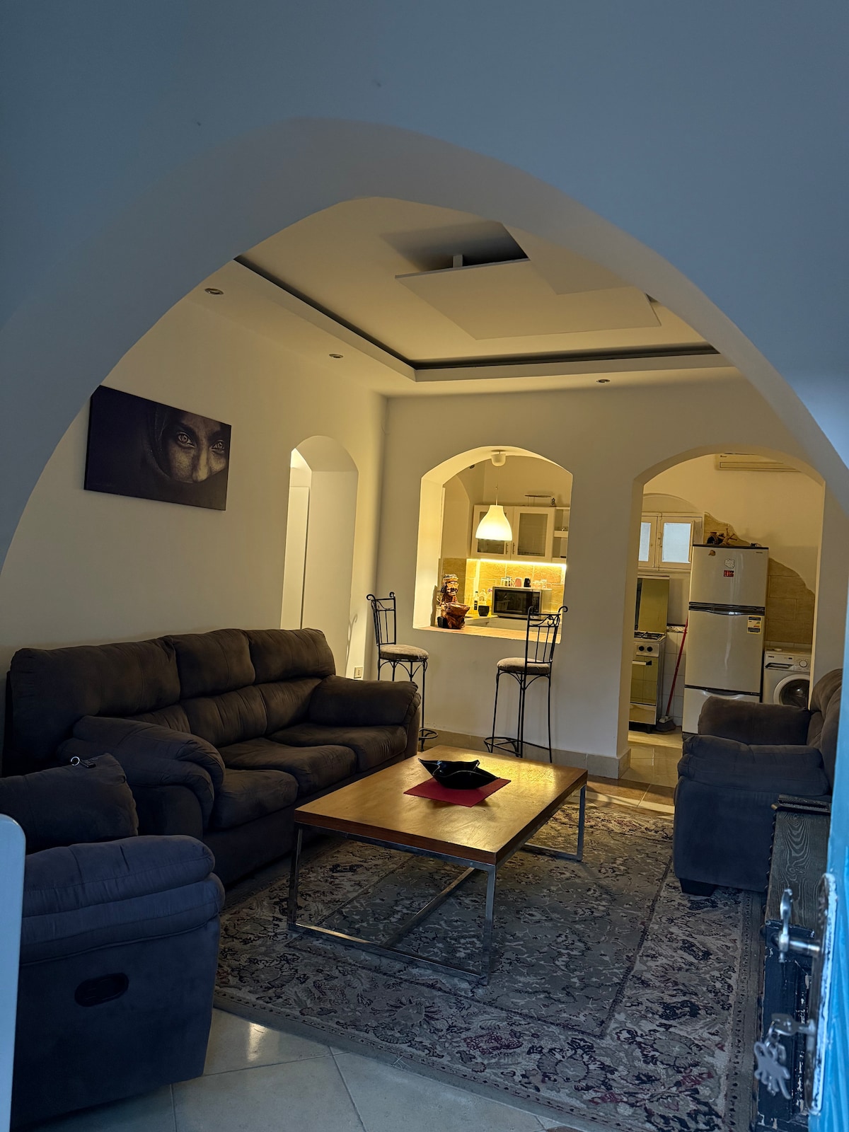 Studio Serenity in El Gouna, located in Kafr- Downtown, offers a cozy and stylish retreat. This fully renovated studio features a large living room, an alcove with a comfortable queen size bed, a sofa, a table with 2 chairs, a flat-screen TV, and internet access. The fully equipped kitchen is ideal for preparing meals, and the bathroom includes a shower and a washing machine. The studio is close to the lagoon, a supermarket, and various restaurants, making it the choice for a relaxing stay.