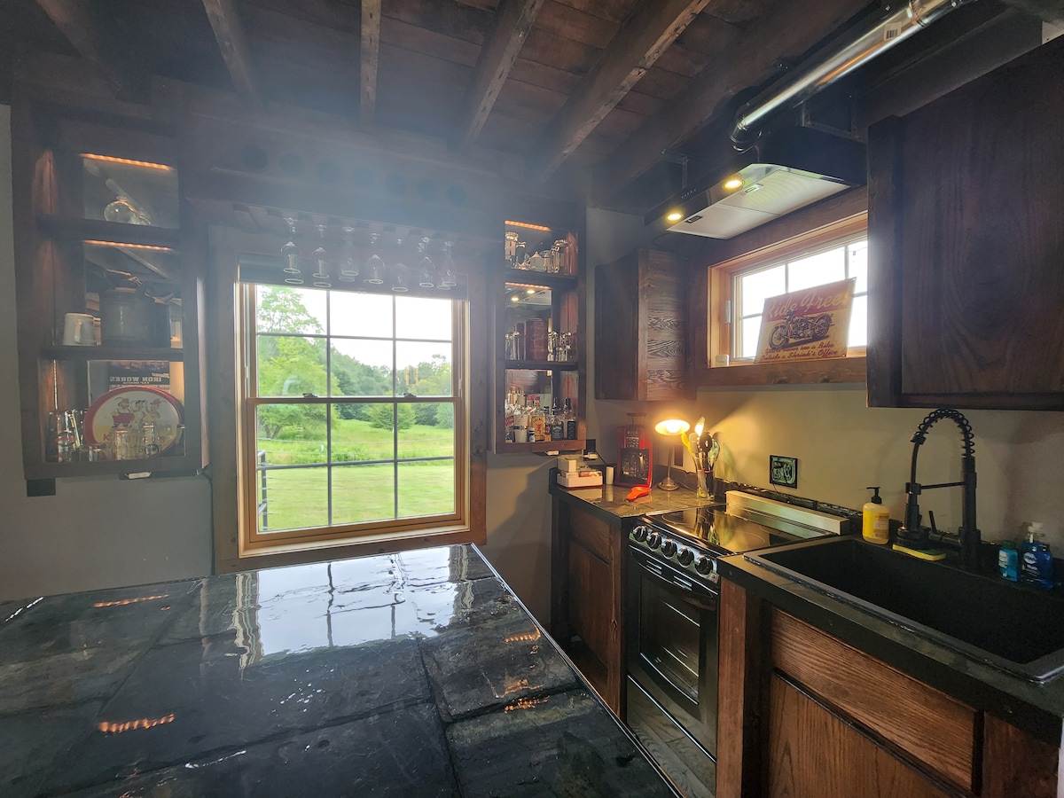 Completely renovated house converted to look like a vintage gas station on exterior. First floor has open living area/kitchen, with functional antique wood walk in cooler, 1/2 bath, bar and garage door which opens to deck. Many reclaimed materials used in construction including brick, doors for bar, etc. Upstairs was modeled after boutique hotel with king bed, full bath and picture window overlooking stocked pond and vintage fire truck. Garage portion not included, but could be available.
