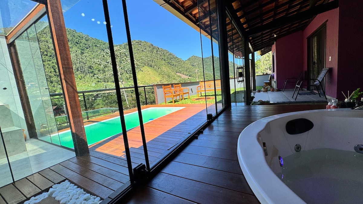 Welcome to @nossocanto_serrarj. Enjoy the modern charm of this house in the mountains. House with swimming pool, barbecue area, outdoor fire pit, facing the river and with a starry sky on clear nights. There are two bedrooms (suites) with air conditioning, excellent quality beds and a comforting noise from the river, and we have fiber wifi. If you want a person to help with cleaning and food during your stay, we recommend local professionals with direct payment to the assistant.