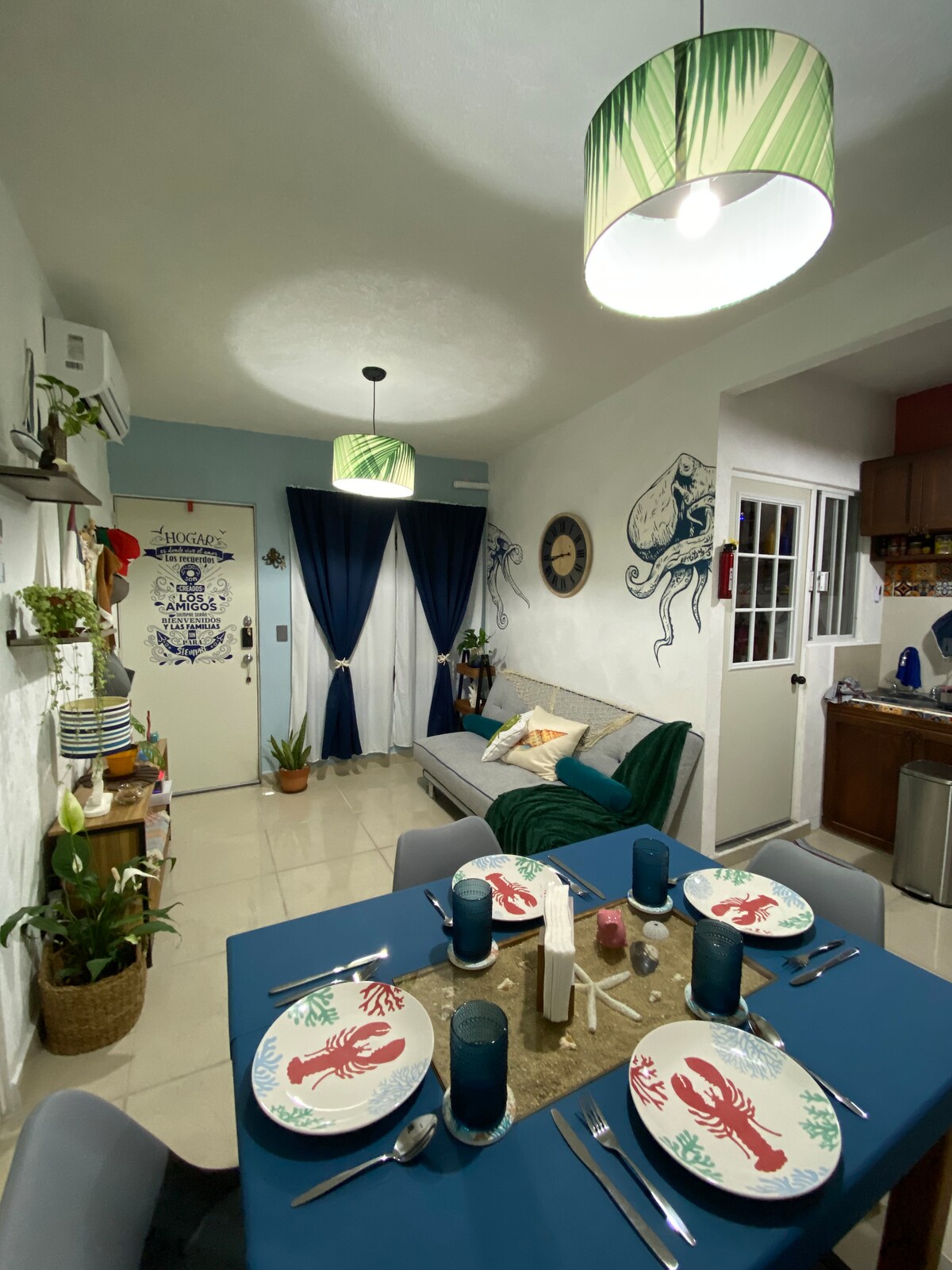 Departamento en planta baja con Aire Acondicionado, estacionamiento propio frente a la ventana y vigilancia las 24 hrs., condominio con barda, agua caliente, Wi-Fi, t.v. smart ROKU, cocina integral, utensilios de cocina, sartenes, platos, cubiertos, refri, horno de microondas, cafetera, licuadora, plancha. El portón de la entrada es a control remoto para los vehiculos. Ubicado a 15 min de la playa de Puerto Marqués, 18 min al Revolcadero, cerca de plaza comercial el Patio.