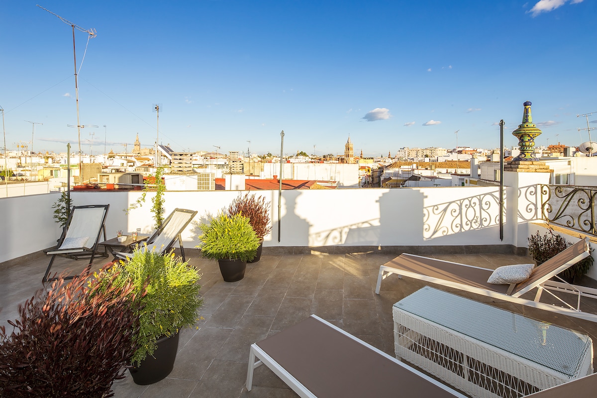 Charming duplex penthouse in the heart of Triana in a fully renovated 19th century house. Enjoy the best views of Seville on its 35 m2 private terrace and its exclusive viewpoint where you will see the Giralda and the Guadalquivir River turn gold at sunset The apartment occupies the 2nd and 3rd floors in a building without an elevator. Check accessibility limitations 1 minute from the Triana Bridge and a 10-minute walk from the Cathedral. Surrounded by history, beauty, bars, restaurants, and charming places.