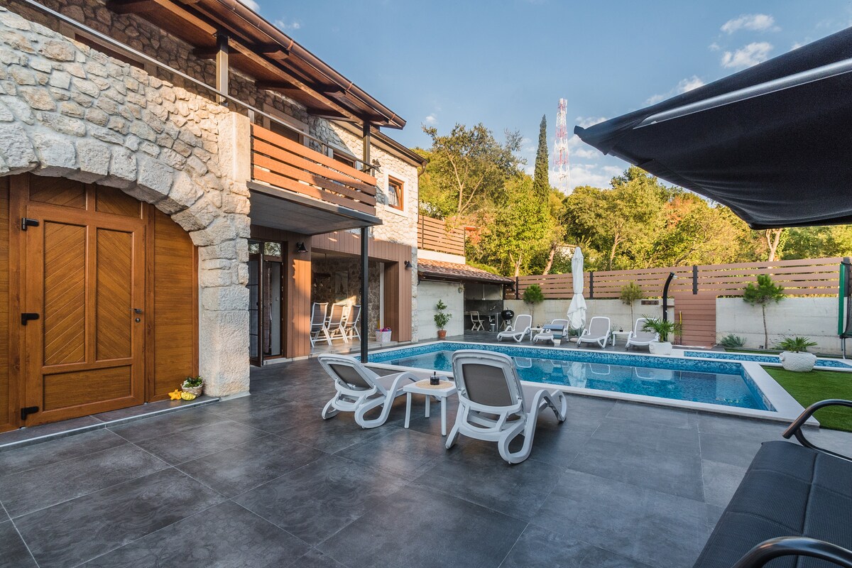 Escape to a private luxury villa surrounded by nature just 5 minutes from Crikvenica. Enjoy a heated pool, outdoor jacuzzi, wine corner and a peaceful garden. Perfect for families or friends looking for privacy near the Adriatic coast. With 4 bedrooms, the villa comfortably accommodates up to 8 guests. Outside, a private pool offers refreshment on hot days and can be heated on request for an additional fee. The sun-lounger area stays shaded most of the day and offers beautiful landscape views.