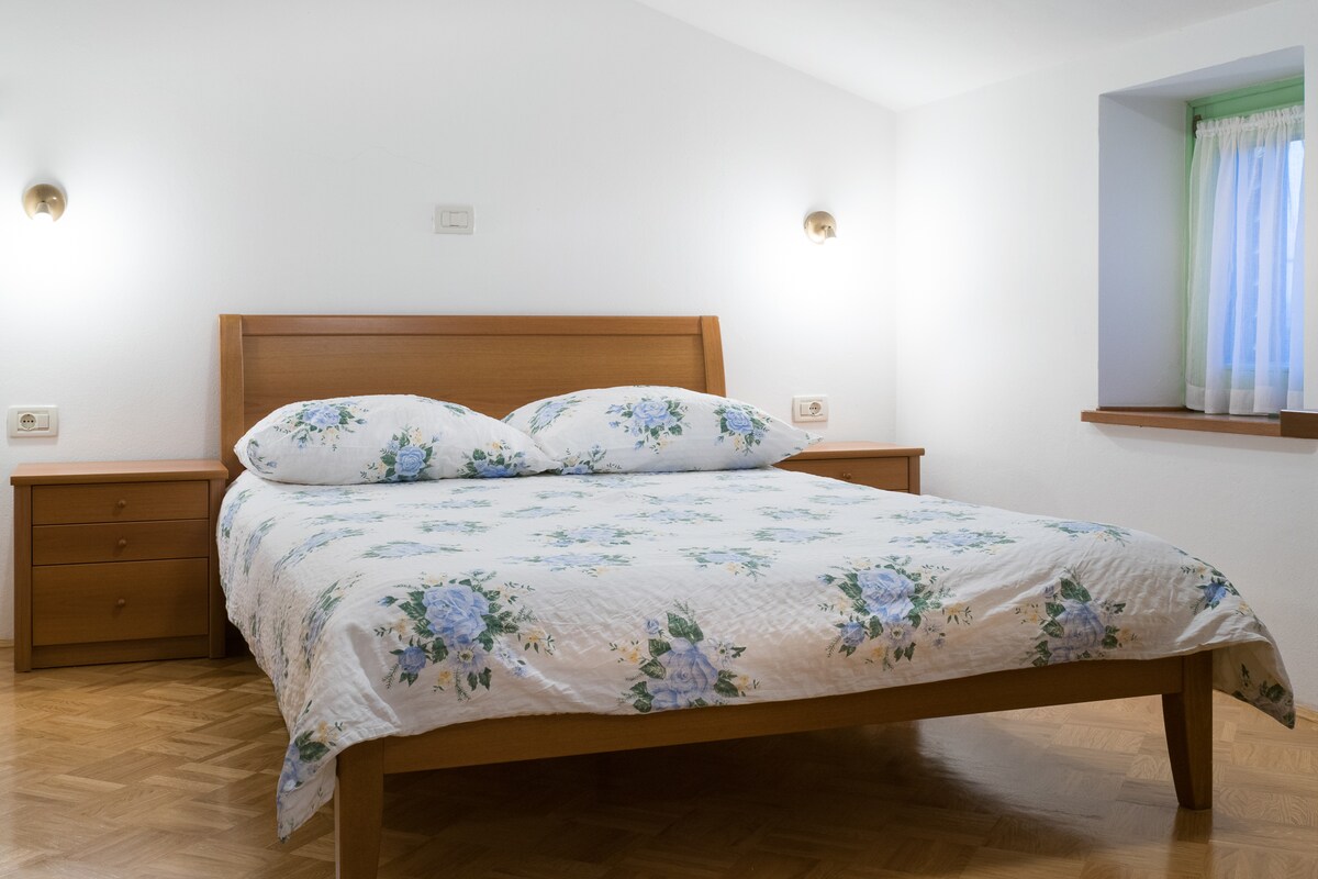 Located on the first floor, this bright and cozy apartment has two bedrooms, a private bathroom and a second full bathroom, an equipped kitchen, a living room with a sofa bed and a balcony. Open view of the sea and the greenery of the Karst. Ideal for families, couples or friends looking for relaxation and nature.
