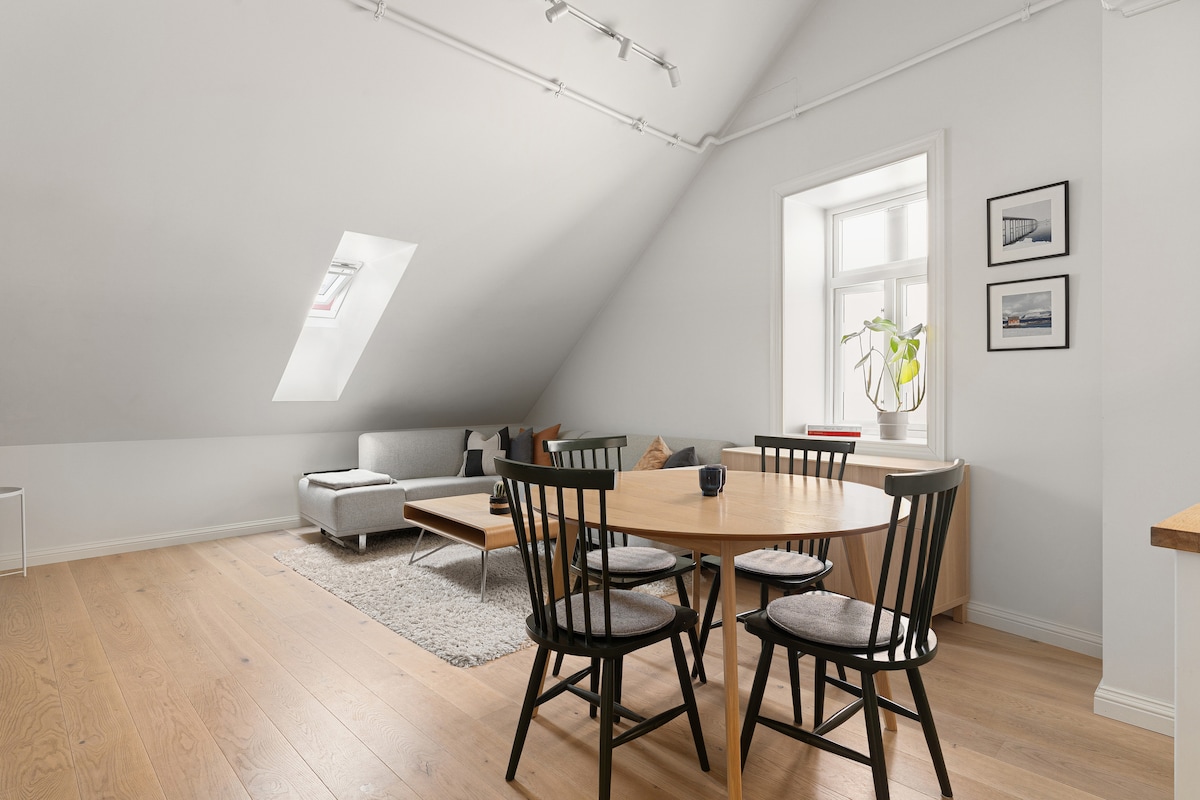 Stylish top-floor apartment by the sea in central Tromsø with an impressive view of the Arctic Cathedral, Tromsø Bridge, Cable car, midnight sun and the Northern Lights. Enjoy Hurtigruta sailing in from the sofacorner and hear waves lapping outside. The entrance is part of a glazed terrace with views to the south. The center is a 10-minute walk away. The apartment is open, inviting, and a nice & comfortable place to spend your time. Age limit to rent: minimum 25 years. NO SMOKING OF ANY KIND.