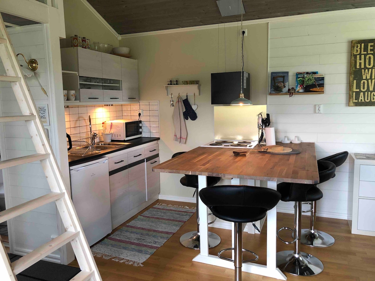 House (25 sqm). Private entrance, toilet, shower cabin & washing machine. The price includes bed linen, towels & final cleaning. One large room with a bed (140 cm), sofa (which can be used as a bed), desk. NO KITCHEN but there is a small refrigerator, micro & water boiler. As a hotel room - larger. Good storage and drying facilities. WIFI, TV with apple TV. Own part of patio. Not shoveled in winter. Parking space - by house. "Trixy" driveway up, due to road conditions.