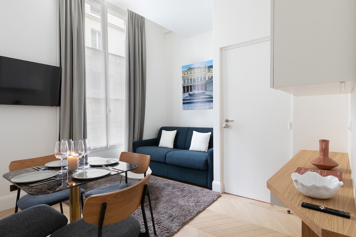 Experience the absolute best of Paris from this elegant 45 m² (485 sq ft) apartment, located in the prestigious 1st Arrondissement. Nestled between the Louvre Museum and Place Vendôme, you are just steps away from the Tuileries Garden and the Opera. Though you are in the vibrant heart of the city, the apartment offers a rare luxury in Paris: absolute calm. Located in a secure building with an elevator, it is the perfect sanctuary for up to 4 guests seeking comfort and style.