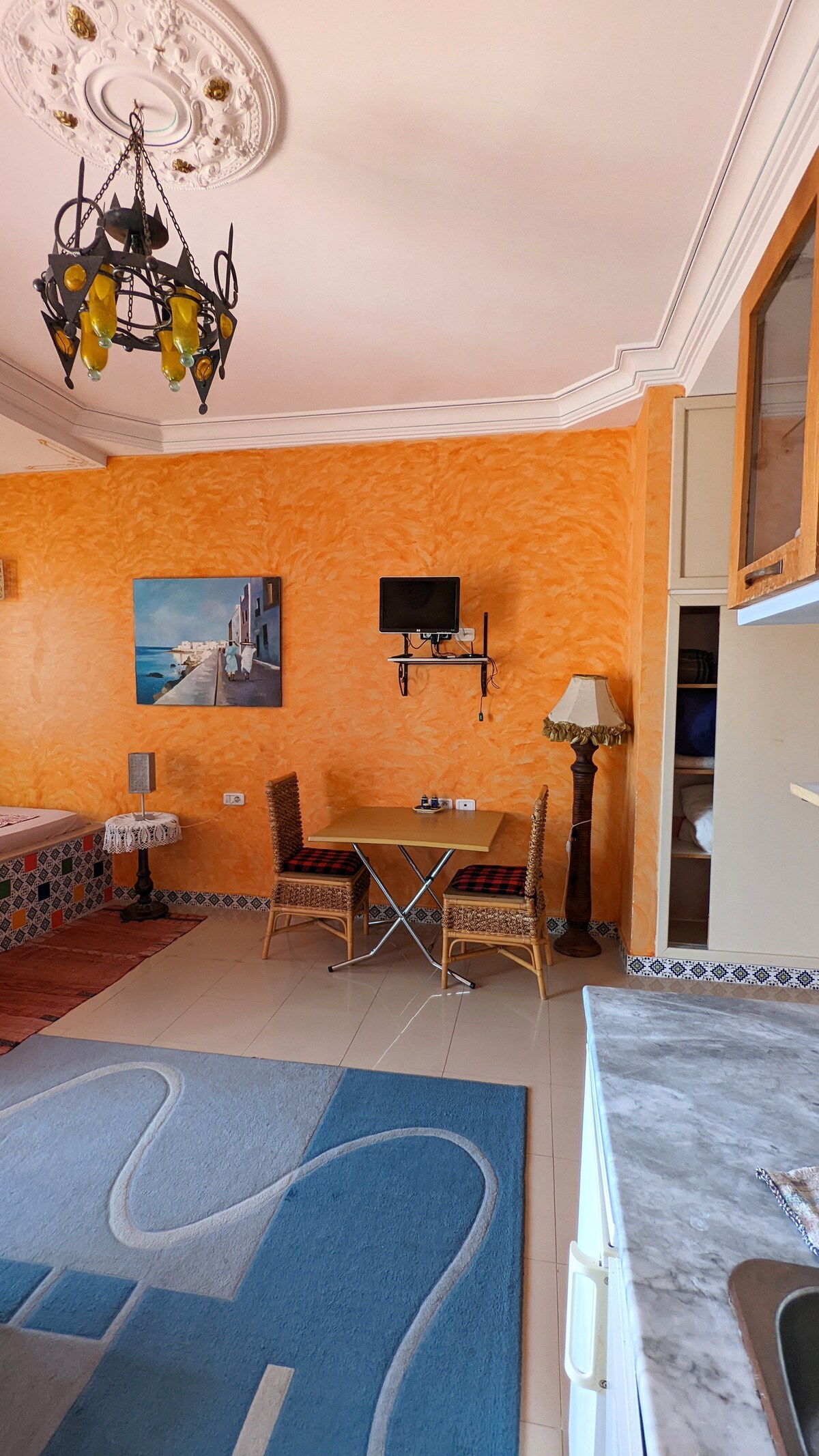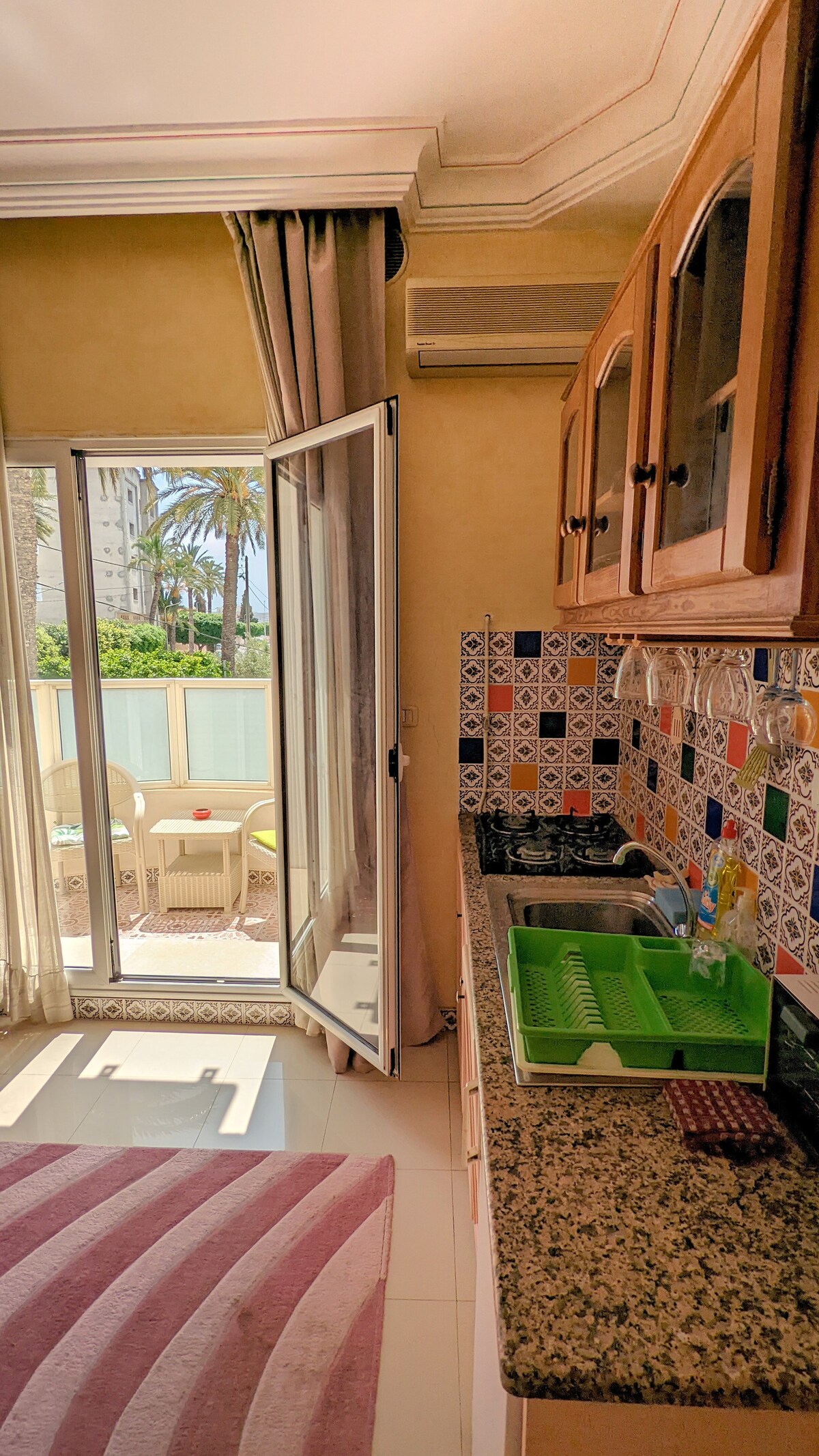 Studio- very calm with garden view in the heart of the city, close to the sandy beach, city center, old town (Medina). no need for car, everything reachable by feet. It comfortably fits couples or couples with one child or baby. With shower, air-conditioner,heater, free WIFI, satellite TV, kitchenette.balcony,towels,linen, utensils... nextdoor: bakery, supermarket, restaurant, coffee shop, fruits shop, pharmacy,polyclinic l excellence