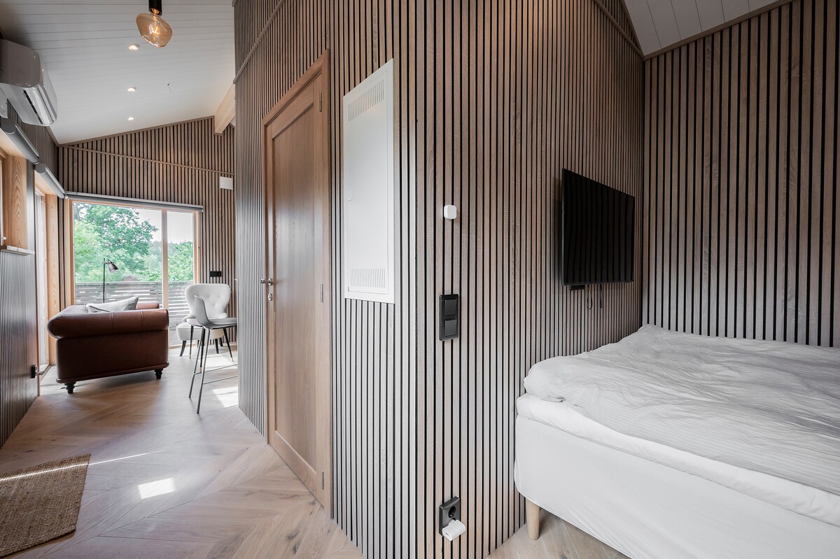 Sjö, golf och härlig skog. Bo fint i nybyggd stuga