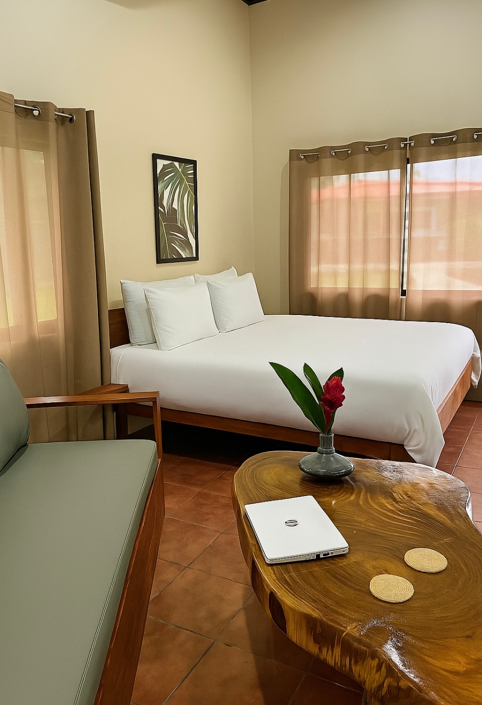 Escape to nature in this cozy cabin surrounded by trees in Orotina, Costa Rica. Perfect for couples or small families looking for relaxation, privacy, and a touch of Pura Vida living. This comfortable studio cabin features a king-size bed and a twin sofa bed, ideal for up to 3 guests. Outdoors: Step outside and unwind by the swimming pool, or walk around the lush garden. Enjoy fresh air, quiet surroundings, bird watching and the beauty of Costa Rican nature all around you.