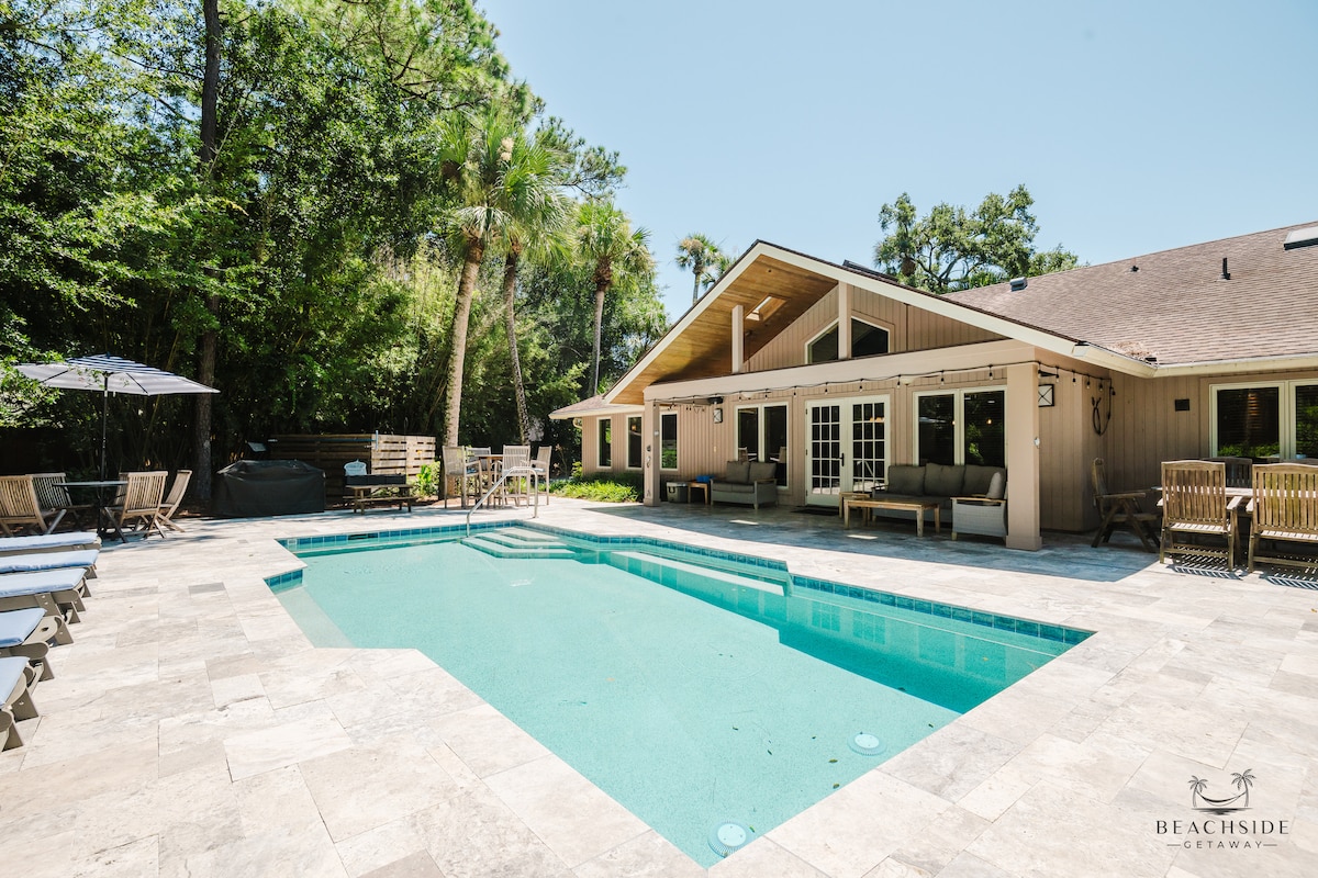 Step into paradise at this luxurious 6BR, 5BA beach house just 30 steps from Hilton Head’s quietest and most beautiful beach! Modern meets coastal charm in this beautifully renovated home, featuring a resort-style backyard with a pool, hot tub, and pergola with an outdoor TV. Sleeps 16 & dog friendly! Perfect for large families or groups. Enjoy unbeatable beach access and stylish comfort in the charming Folly Field neighborhood just minutes from world-class dining, golf, and island adventures.