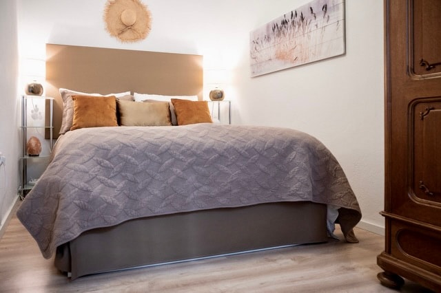 The Blue House is a stylish guest house (130m2) with a great living atmosphere. The living room with its open, stylish and sensual bathroom is 50m2. From the balcony you can see the large natural garden. On the ground floor is the large kitchen, a dining table for 8 people and a bar. The guest house is ideal for a couple and their guests. In the summer the garden can be used in its entirety. The breakfast terrace is directly in front of the kitchen. The pergola is ideal for lunch and dinner.