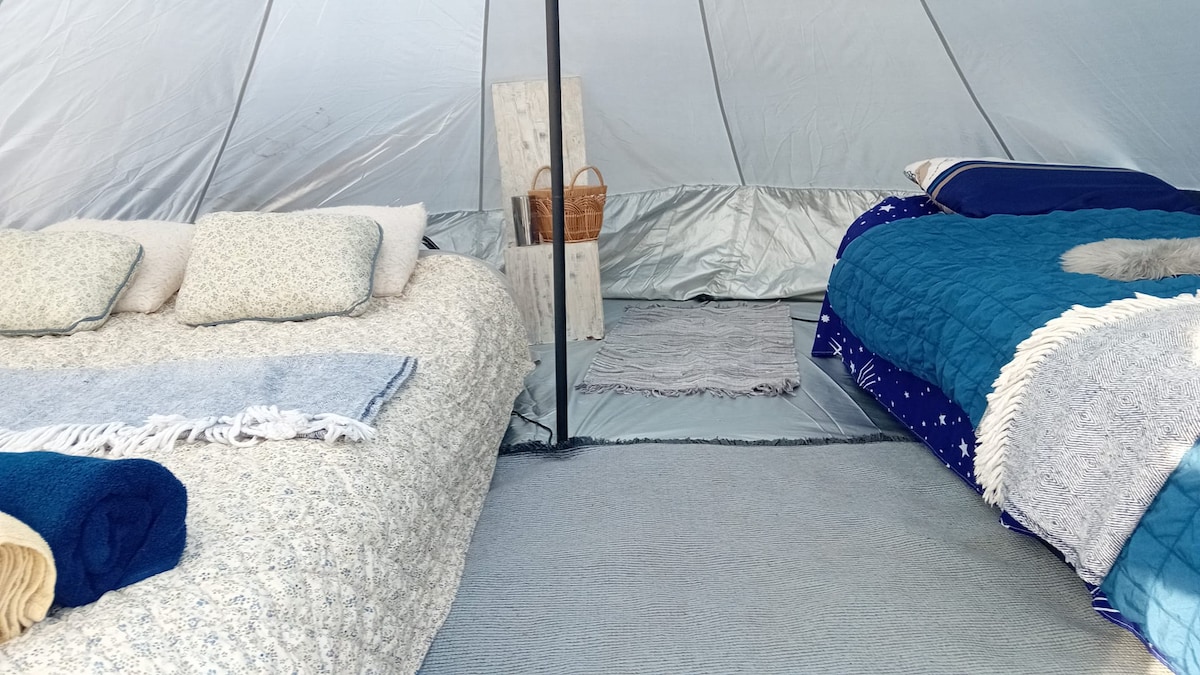 In the A house, you will find a tent with bed linen and memory foam for a peaceful night's sleep under the shelter of a wooden roof. Experience camping in a slightly different way, without having to pitch a tent. The tent accommodates 2 adults. Pets are not allowed in this accommodation.
