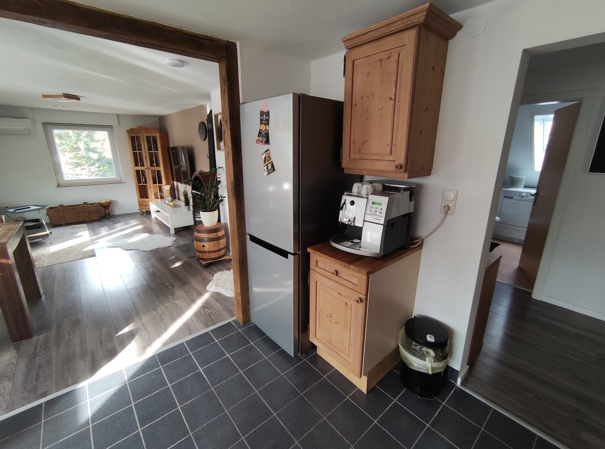 Small, open-plan apartment/granny flat on the ground floor with fitted kitchen (coffee machine, toaster, kettle, fridge with freezer), bathroom (shampoo, shower gel, etc.) with shower and toilet, towels, bed linen, hairdryer. Bedroom with wardrobe, living room with sofa bed, dining table, TV. Please let us know if you want us to make the sofa bed. Families with children are very welcome, there is a high chair available as well as various toys.