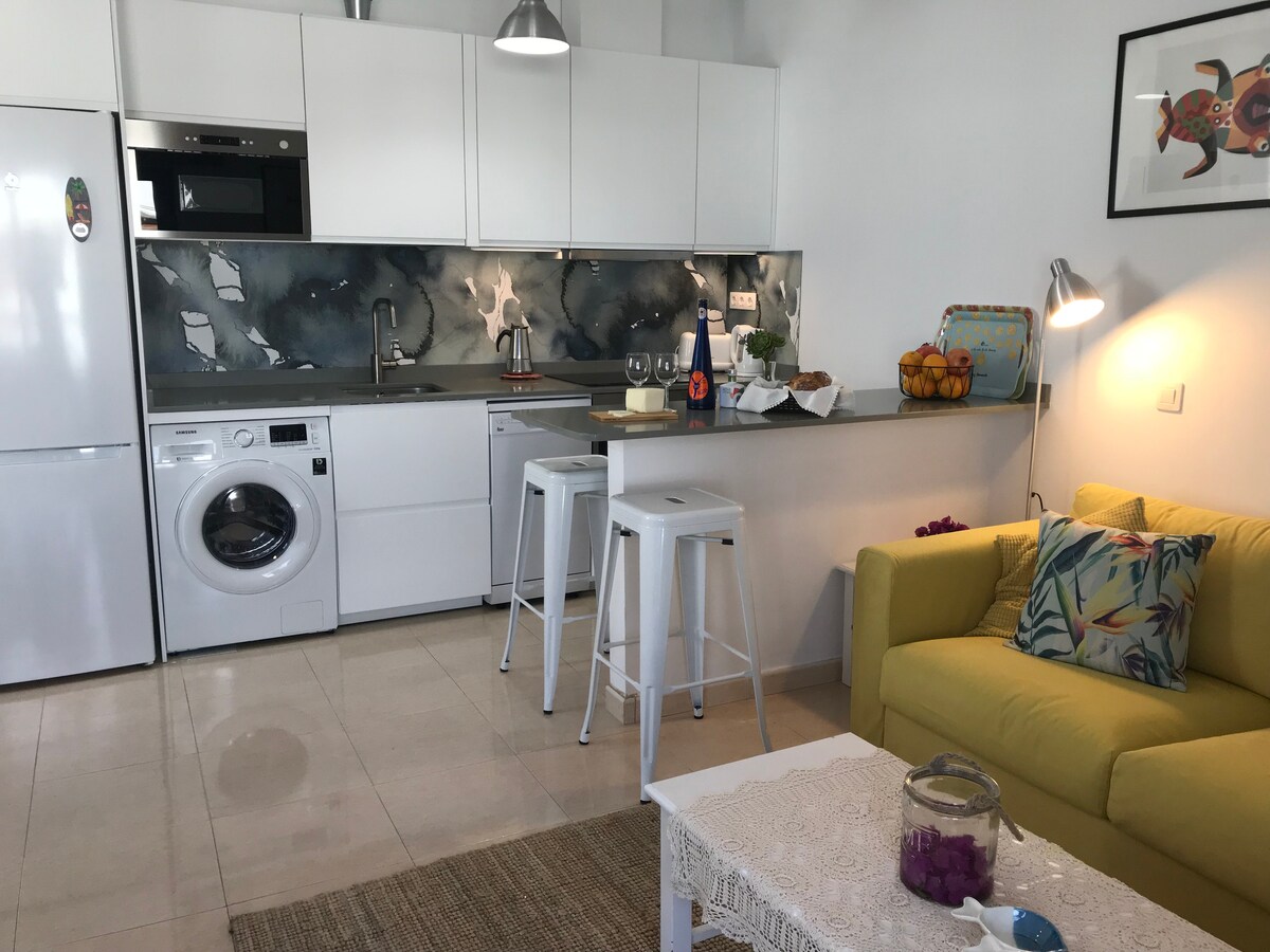 Nice apartment on the top floor for two people, consists of 1 bedroom, kitchen, living room, full bathroom and terrace. It is located 5 km from Arrecife, 1.4 km from the airport, 3 min. walk from the beach and a maritime avenue that runs from Arrecife to Pto. del Carmen perfect for walking or biking. It is close to Deiland Mall, restaurants and bus stops and taxis.