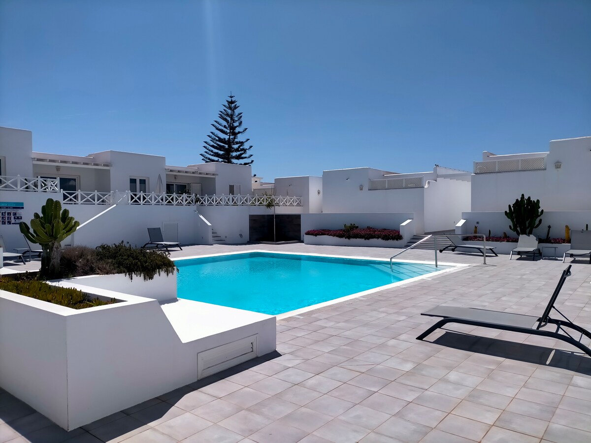 Cozy inside, attractive outside. This apartment with a large private terrace and shared pool allows you to enjoy the outdoors in a comfortable and leisurely way. Its location near the beach and all amenities, located in one of the best non-tourist areas of Lanzarote, and at the same time in a strategic point of the island to visit it, makes it an incomparable refuge. The apartment is located in the Playa Honda area, between Arrecife and Puerto del Carmen. The environment invites tranquility and relaxation, to enjoy long walks or bike rides along the beach and its surroundings. A two-minute walk to the beach and Playa Honda promenade. A five-minute walk from a nice shopping mall with a supermarket, shops, pharmacy, cafes, and a movie theater. Parking is available on the street and generally at the apartment door. Non-tourist area where you can mix with locals and local restaurants.