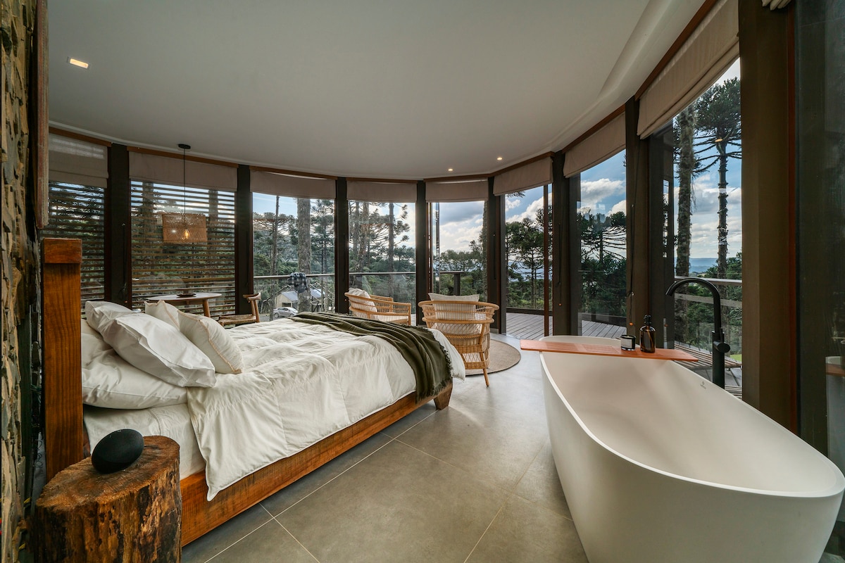 This romantic cabin is located in one of the most beautiful regions of the Santa Catarina mountain range, amidst the araucaria forest. Cabana África was designed to provide a true immersion in nature. Through the glass windows, you will enjoy exuberant landscapes from sunrise to sunset. The wood slat finish, combined with the walls covered with rustic stones, ensure the space's coziness and privacy. Come and live this experience!