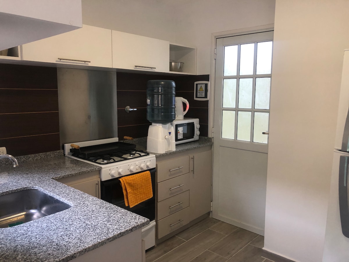 Es un lugar preparado para el turista esta equipado con todo lo necesario para poder estar cómodos es un monoambiente con un pequeño patio con parrilla para hacer asados, cuenta con internet, un gran sillon para relajarse y mirar TV o inclusive para dormir comodo un adulto. Cuenta con una cama de dos plazas y un baño grande.
