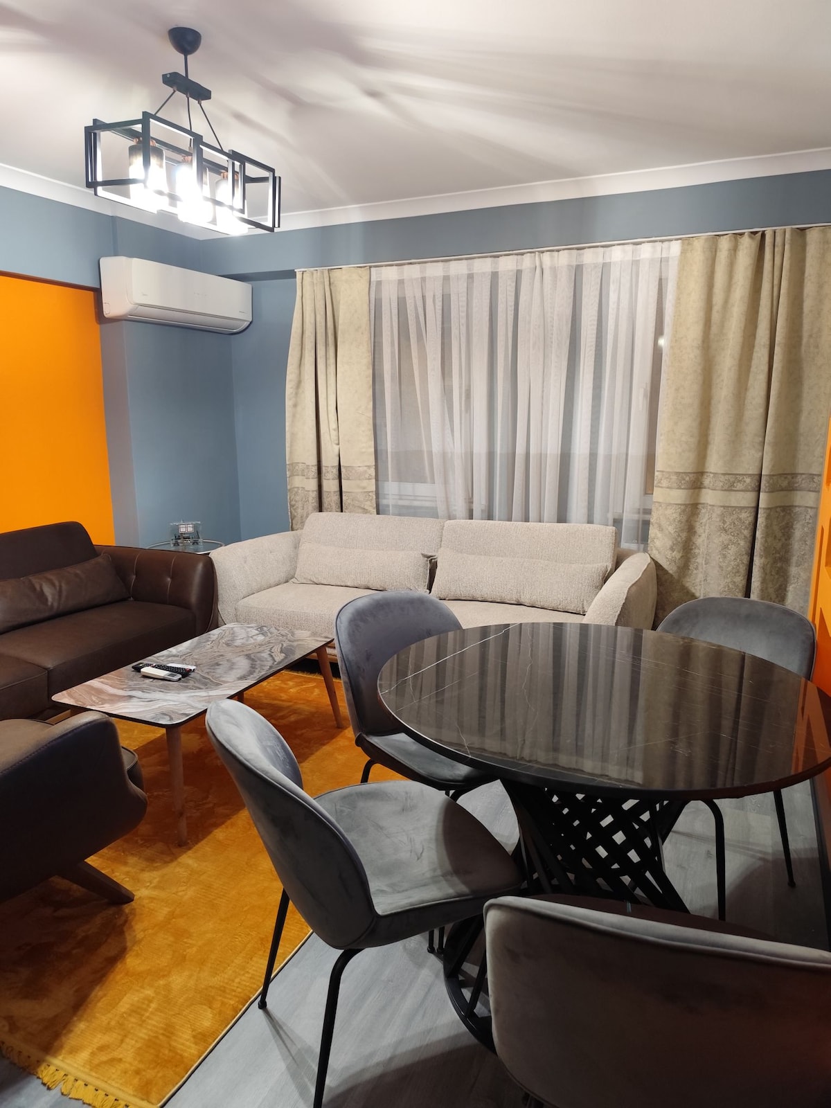 Our apartment offers comfortable accommodation for up to four guests with two bedrooms. In the spacious living room, you can enjoy a movie night, play Xbox, or listen to music with the Marshall sound system. The open kitchen, bright bathroom, and practical amenities make it suitable for both short and long stays. The most enjoyable space is the terrace, decorated with seating areas—perfect for sipping your coffee or having pleasant evening conversations accompanied by music.