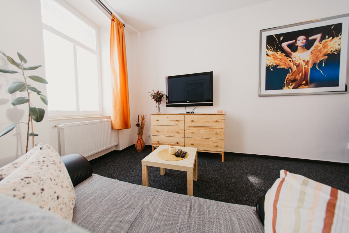 Discover the charm of Děčín in our cozy apartment that makes you feel right at home. The main train station is just 3 minutes away, offering direct connections to Dresden (1 hr) and Prague (1.2 hrs). Buses (2 min) take you to Bohemian Switzerland or Tisá Walls. We provide storage for bikes/strollers; hypermarkets and supermarkets are within 5 min. Parking by the house (paid) or 2 min free. We'll gladly recommend the best our region offers. We look forward to your visit :)