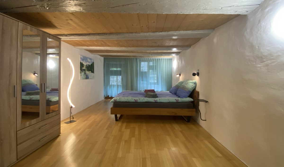 This spacious apartment is located in the cozy attic of a typical Emmental farmhouse named Bühlmenschwand. In addition to the hosts, friendly dogs, cats, sheep, donkeys and chickens live on the Bühlmenschwand farm. From here you can enjoy beautiful walks through the adjacent woods and meadows, or further discover the Emmental by car or bike.