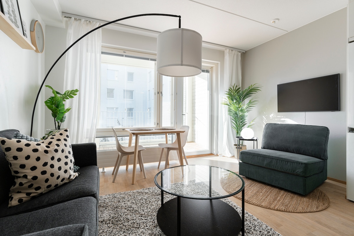 Take it easy at this unique getaway and enjoy your stay in this fairly new 34 m2 condo & studio (+13 m2 balcony). Calm neighborhood with excellent transportation connections makes accommodation comfortable and makes you feel like home. The bus stops are located right near near the apartment and the metro station is only a 5-minute walk away (450 meters from the apartment) which takes you to the city center within 12 minutes.