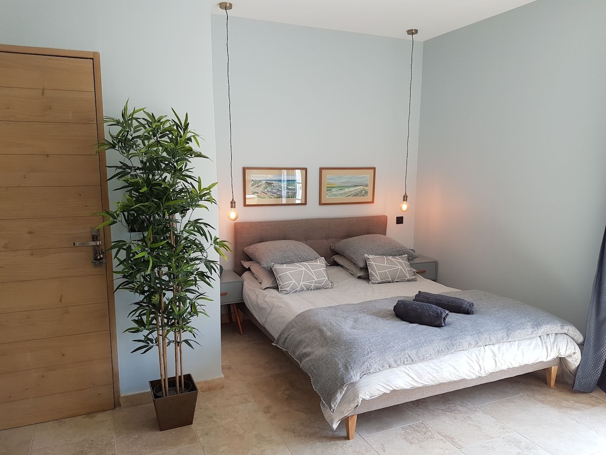 Feel@Home Nemausus® offers️ you for rent this independent luxury accommodation ⭐️⭐️⭐️⭐️ at the gates of Nîmes (7 min). It consists of a bedroom with️ queen size Bultex® bedding (160/200), a living room open to the fully equipped kitchen, as well as a bathroom with bathtub. The cinema option has been selected with an xxl screen (75 inches) 4k and the Netflix streaming service.🎥🎞🍿 You also have a 160 m2 private garden and a private parking space.🅿️