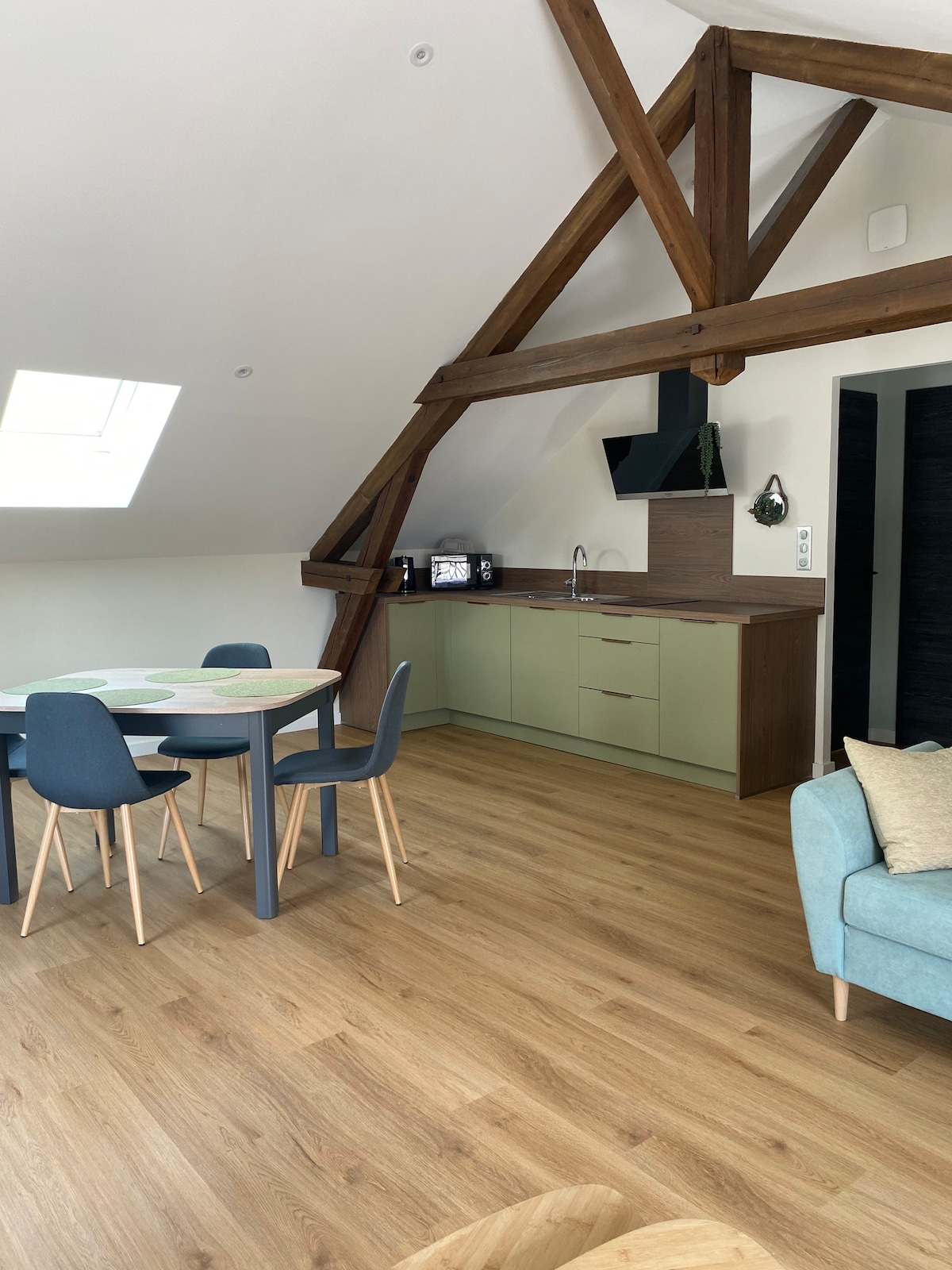 Kick back and relax in this calm, stylish space. You have a free entrance overlooking a fully equipped kitchen open to a living room and living room with sofa bed for a possible third person. Bathroom with walk-in shower and adjoining toilet. Large bedroom consisting of a double bed and dressing room. Come and recharge your batteries in the countryside and enjoy the surrounding hikes. (Ponds, lakes, etc.)