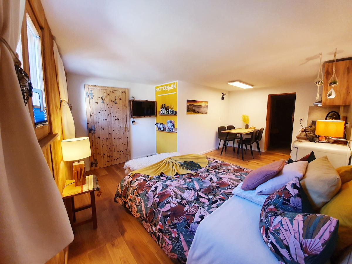 Dogs welcome.🐶 Tesla charger available free of charge. At the gates of Crans-Montana station, Le P'tit Chalet is a unique place to stay. In this independent 35 square meter studio with tasteful decor, there is an air of vacation and tranquility. It feels good. The large private terrace with barbecue is made for relaxing. We offer you homemade jam and a small bottle of local wine.