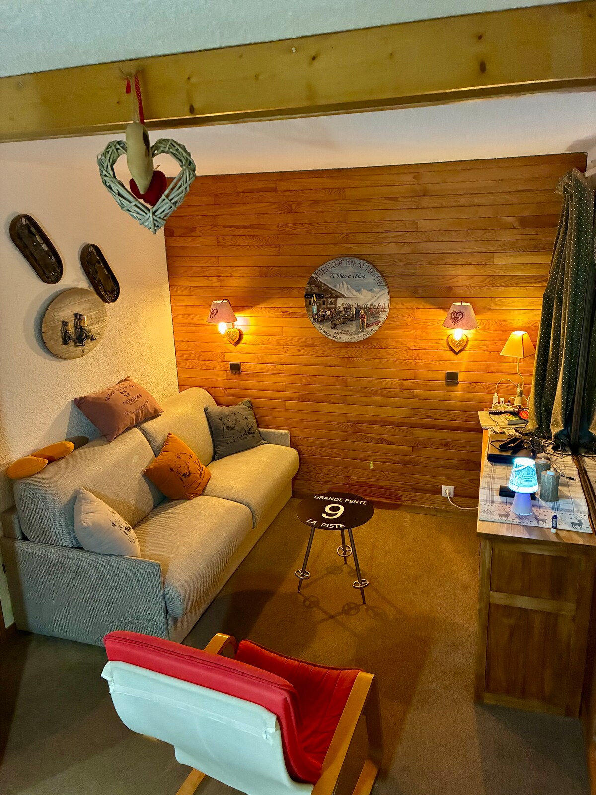 In the center of the resort, you can go skiing, walk on the lake, have a drink or dinner without touching the car. Free buses allow you to go to Val Claret (cinema) or Lavachet, see below, if you want to change your environment. A ski locker is at your disposal. 6th floor, be careful the elevator only serves the 5th floor, one floor on foot. Since the photos were taken, the furnishings have been improved, especially the curtains! More current photos to come.