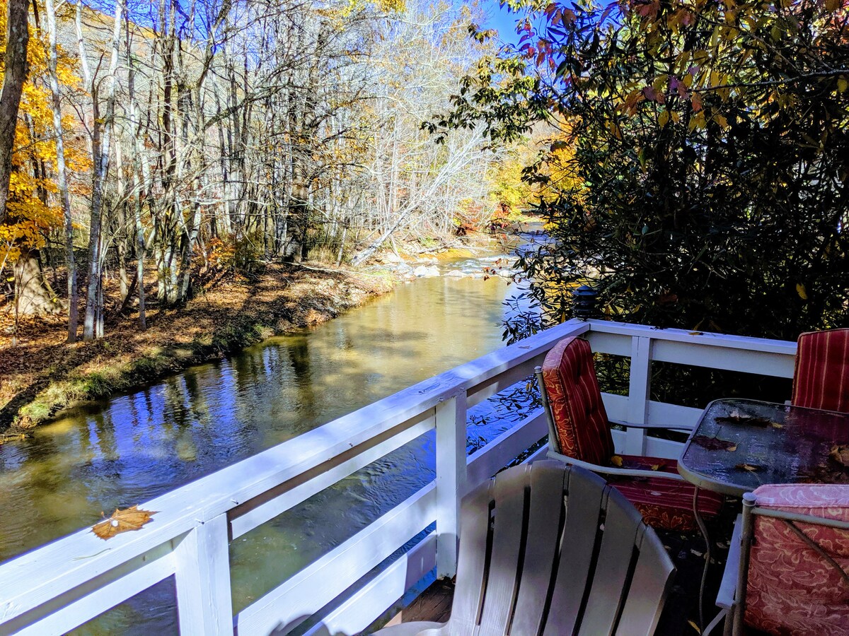 Mountain cabin in the heart of Valle Crucis with a Hot Tub, Fire Pit and peaceful River views — perfect for couples or families looking to unplug and reconnect with nature. 🏞️ Location, Location, Location! 🎣 Trophy Trout Fishing. Riverfront! One mile from the original Mast General Store & Valle Crucis Park! 20 mins to Boone & Banner Elk. 30 mins to skiing/snow-tubing & all activities. WiFi, Sit-Down Arcade, SmartTVs, Gas Fireplace, Gas Grill, Fire Pit & 600SF of decks. Dog Friendly.