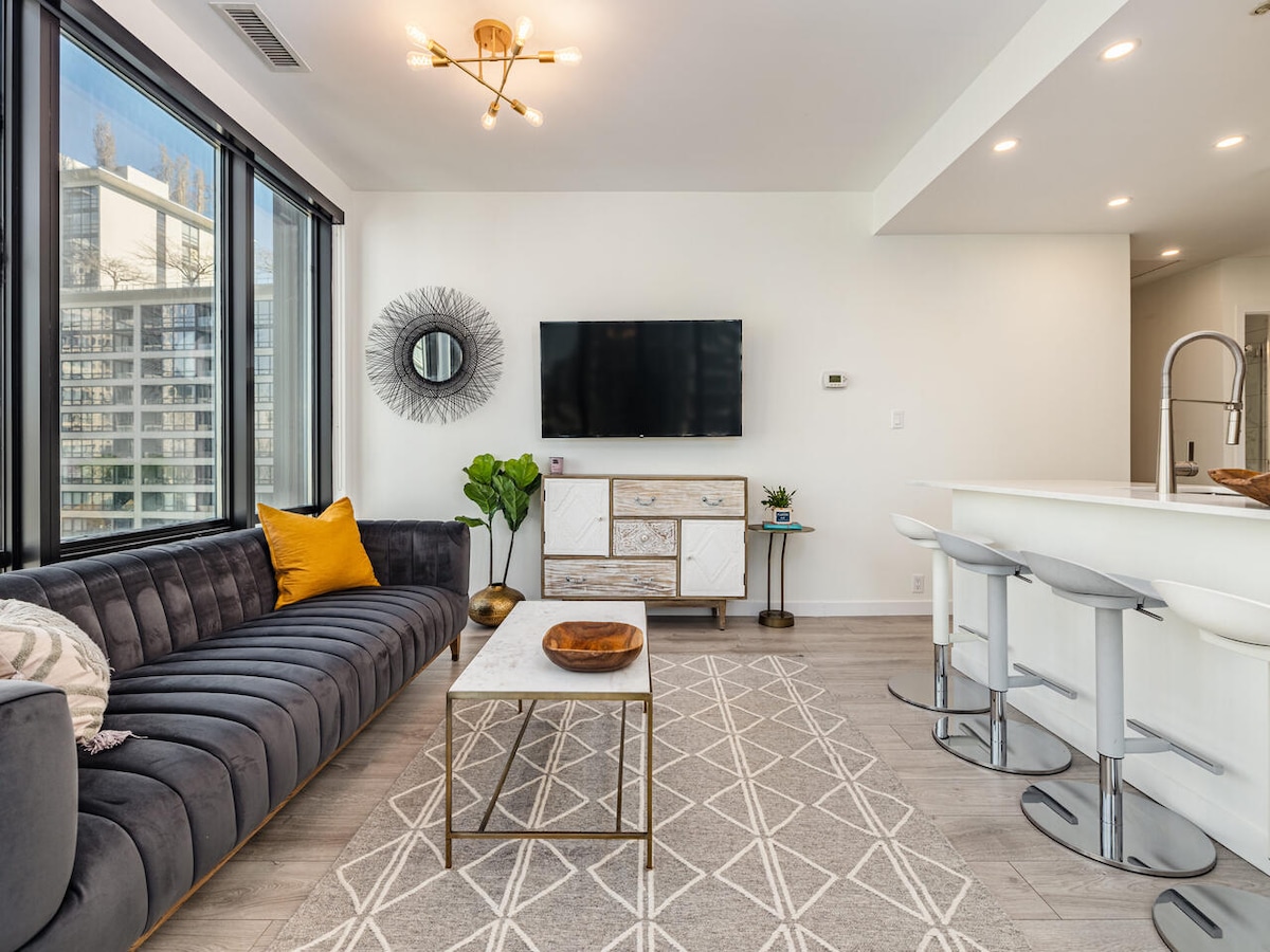 Welcome to this stylish, mid-century heritage loft in downtown Vancouver's Gastown! This space is equipped with a lux King Bed, 55 Inch Smart TV, great WIFI, desk for home office, fully stocked kitchen, huge walk in shower, and more! An open concept 670 sq. ft loft, enjoy this space as your home away from home designed with modern comforts and style!!