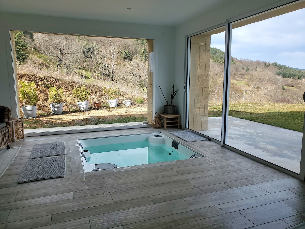 In the heart of the Pilat Natural Park, near Ardèche, with direct access to hiking trails. New independent accommodation with private spa, integrated, queen size bed, massage table, terrace accessible from the spa and offering a view of the Alps and Mont Blanc in clear weather. A large terrace upstairs. Parking at the entrance. All the comforts you need for a lovely vacation in a green and privileged setting. 30 Min from A7, 1 hr from Lyon. Bed linen, towels, bathrobes provided.