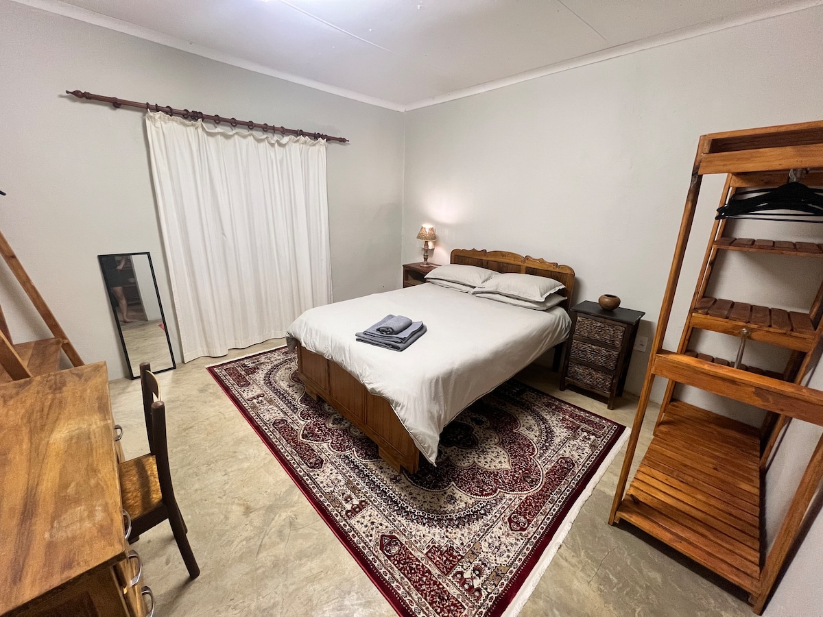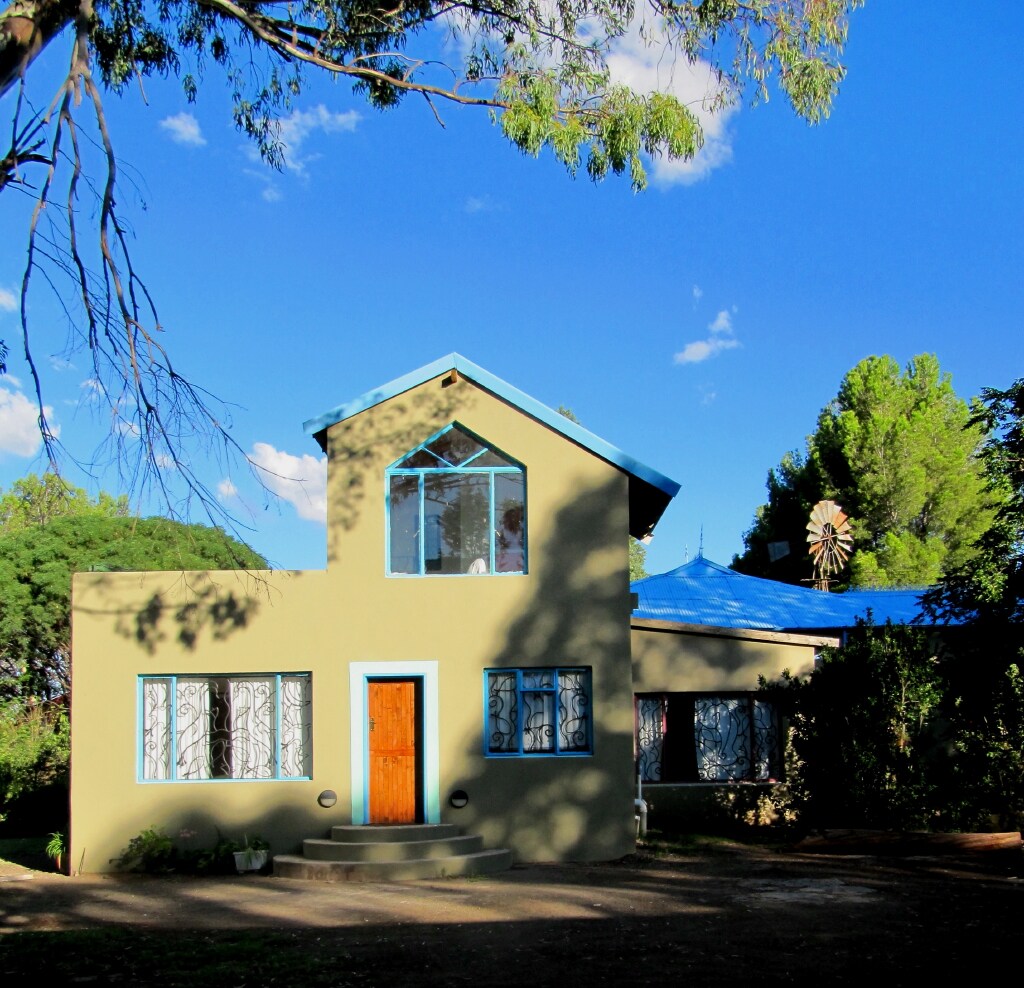Mud Manna is made of earth dug from nearby and crafted with love. Beautiful touches add to the rustic and artistic atmosphere, like handmade stained glass bird windows. Sue's paintings abound. The house is open plan with curtained privacy. Space and views from the stoep will keep you peaceful and calm. Bokmakieries, chanting goshawk, donkeys in a field across the road, wandering horses and cows, a stoep swing... Self-catering and self service. It is next door to Sue's home.