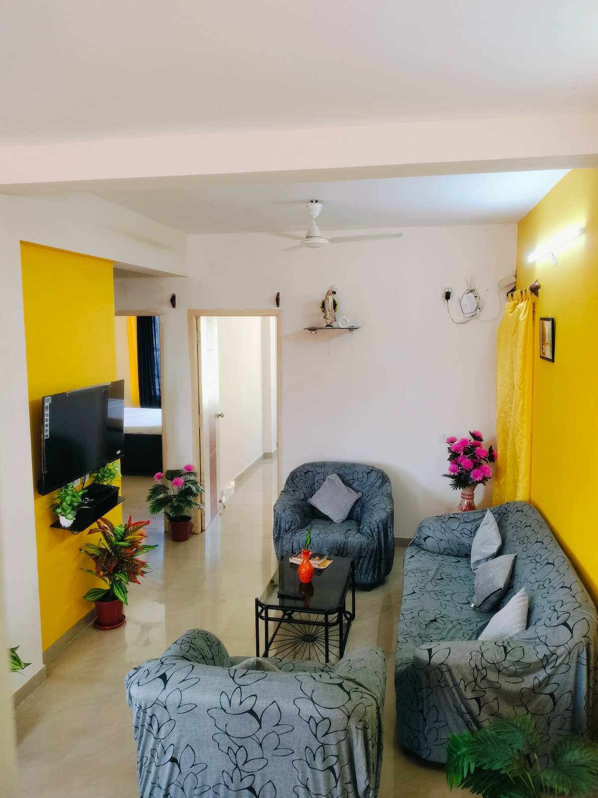 Relax & unwind in this spacious and serene space that is aesthetically designed keeping all the Boho vibes in mind.Tucked in a peaceful lane surrounded by greenery & Opposite a 5star hotel.The apt is a short 5min ride to one of the best beaches in SouthGoa. Packed with all appliances & a fully functional kitchen, you can easily stir a meal.The apt also has power backup incase of power cuts so that your WFH does not get disrupted.Equipped with high speed 150MBPS wifi connection for your WFH needs