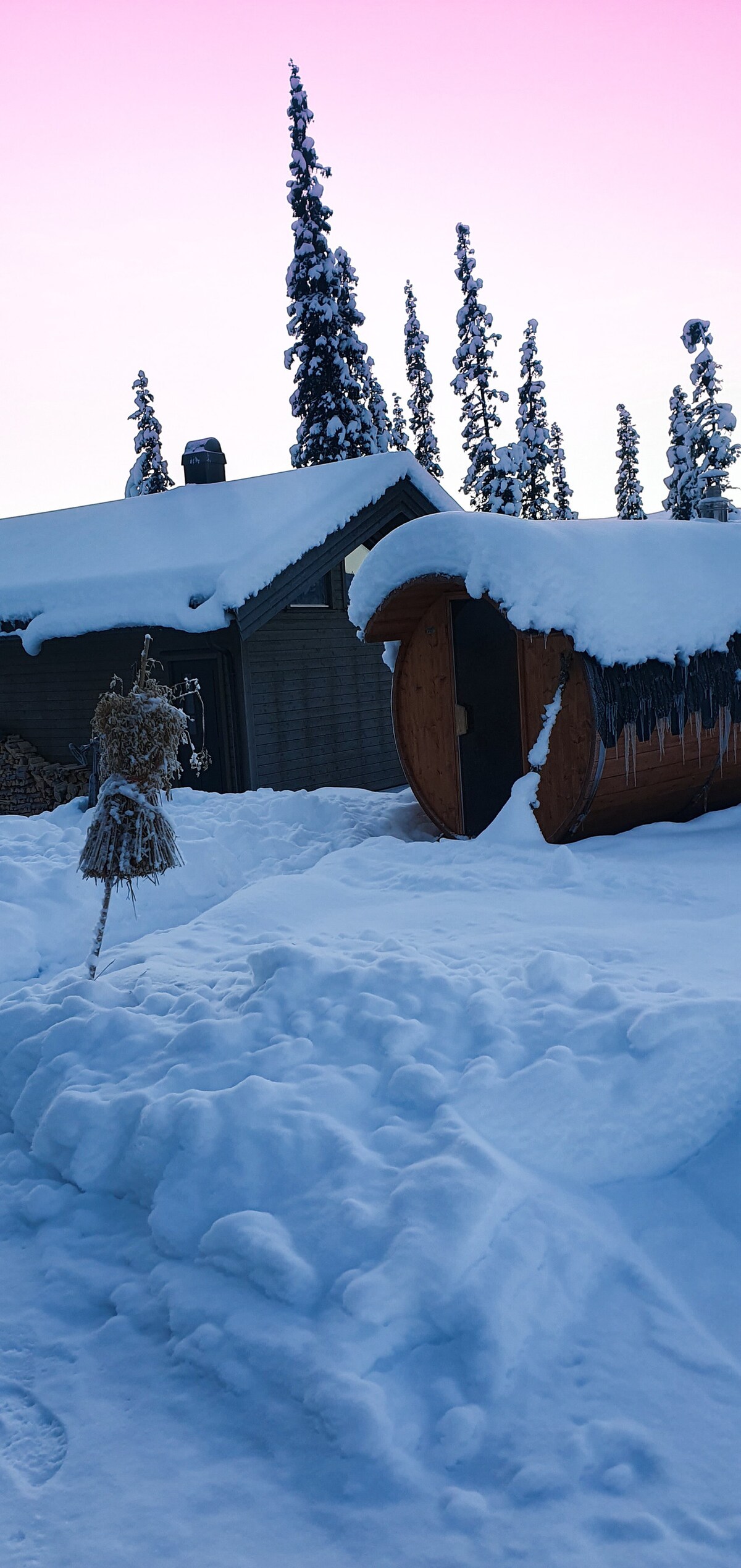 Visit us in the mountains, at almost 1100 meters above sea level, and find tranquility.. Enjoy stunning views, hike (skiing or snowshoeing in winter) and finish with a delicious bath in Tyin. In winter, for the most adventurous, there is also the possibility of ice bathing! Afterwards, you can relax in the sauna (extra cost). (Ice bathing is only possible in special seasons) Bring your favorite book, sit back, and recharge in this beautiful nature that surrounds you. Welcome to Tyin and "Veslebui"