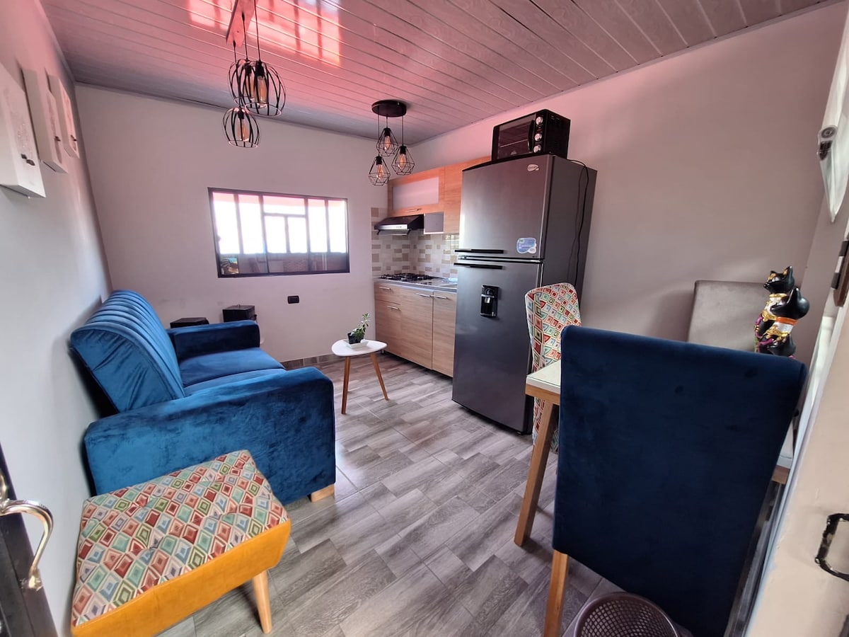 Es un apartamento acogedor para descansar, ubicado en una casa de familia, es un primer piso es privado cuenta con dos habitaciones y 4 camas. Pero, en la sala cuando son grupos de 10 personas como familiares se arman 2 camping con colchón y buenas cobijas. Tenemos calefacción para el frio en la noche. Ducha de agua caliente. Servicio de cocina.