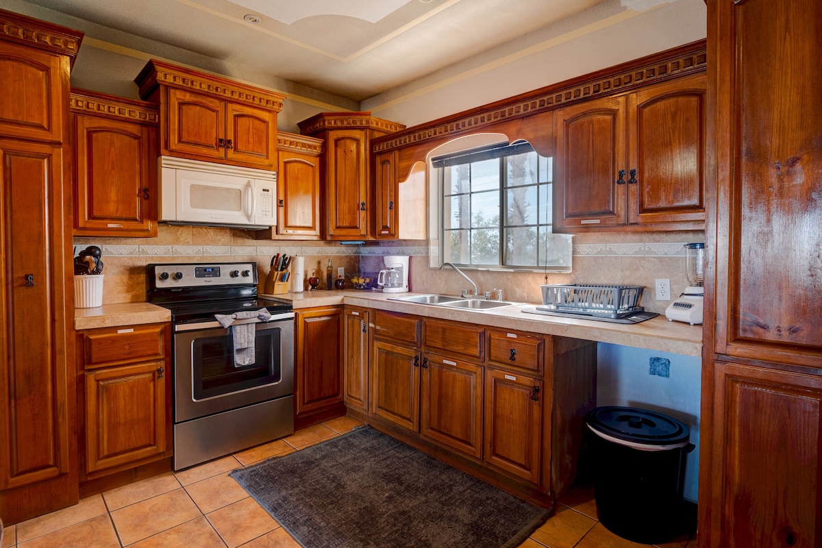 Experience San Felipe like a local in this Charming 2-bedroom house. Nestled in a beautiful and serene setting. 1 block to beach Each bedroom has a queen bed. 1 bathroom and 2 free parking places with amenities like AC, Heating, WiFi(75inch Smart tv, kitchen is small but is fully equiped microwave coffee maker blender toaster and all dishes silverware pots & pans the home is exceptionally clean partial ocean view. Allows children ages 9+.