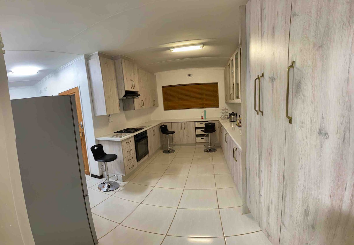 Relax with the whole family at this peaceful place to stay.Our house is close to the hospital, supermarket and we assist you with wifi,aircon,dstv and cleaning service.There is a nice BBQ area and a garden for the children, the house is pet friendly and is very safe with a camara system and electric fence.The house is next to our guesthouse where you can enjoy a breakfast or if you have a bigger group.With 12 years experance in the hospitality industry we are sure that you will enjoy your stay