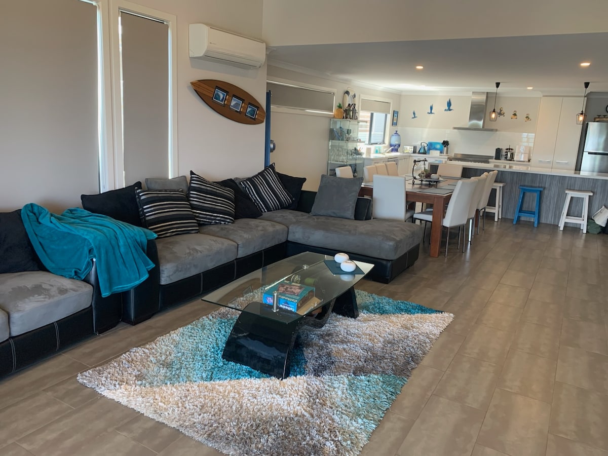 Family Foreshore Beach House. Tucked at the end of a quiet culdesac this relaxed foreshore hideaway is made for barefoot holidays. Wander to rock pools, play on the lawn, watch wallabies graze and kookaburras laugh in the trees or gather on the deck as the BBQ sizzles and waves roll in. Two living areas give families space to spread out while cosy bedrooms invite slow mornings with sea views. A fully equipped kitchen makes longer stays and entertaining a breeze your island home away from home