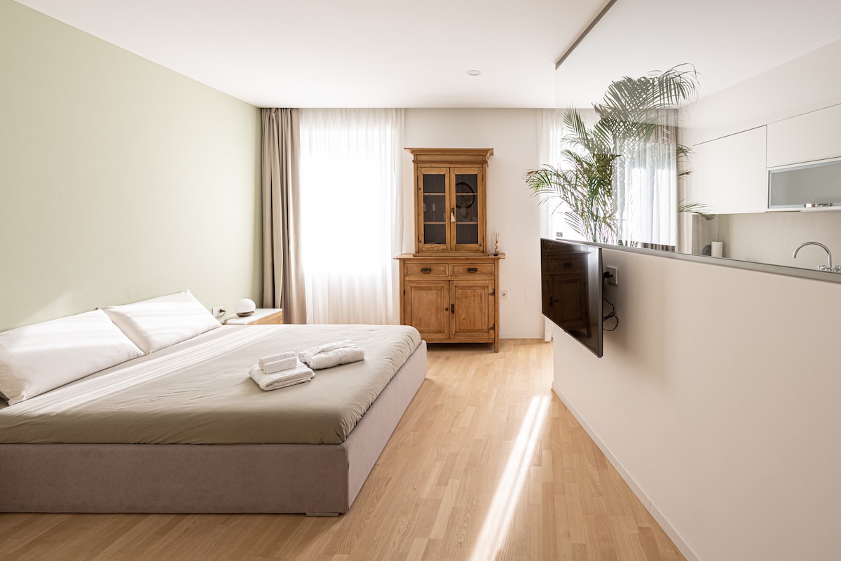 CIPAT 022139-AT-054202 Studio apartment located on the third floor, without elevator, of a beautiful 18th-century building in the central area of Pergine Valsugana. Completely renovated, cozy and with all the essential amenities available: breakfast, TV, pocket Wi-Fi, kitchen, bathroom (no bidet). Quiet, peaceful and bright. A 10-minute walk to the station and about 2 km to Lake Caldonazzo, also reachable by bike path. 30 minutes from the Panarotta ski slopes.