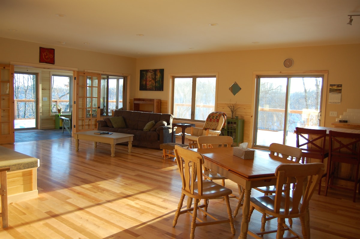 Very private on-the-grid cabin overlooking the Kickapoo River. Kitchen & bath, dining room, one bedroom and futon in the large living room. TV and internet, laundry and cooking. Bring your own phone. Two additional cots provided. Stunning views for every season, a unique and colorful experience in nature any day of the year. The best hunting and fishing, canoeing and horse riding, nature trails, morels and foraging.
