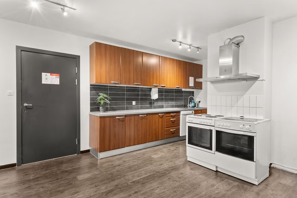 This functional two-bedroom apartment suits both families or a group of colleagues. The multi-functional kitchen island includes a microwave combination oven, electrical stove top and refrigerator, as well as all necessary kitchenware, an electric kettle and coffee maker. Your private bathroom is equipped with a shower and hairdryer. A shared laundry room is also available for your covenience. Wifi, TV, bed linens, towels, weekly cleaning and final cleaning are included in the cost of the stay.