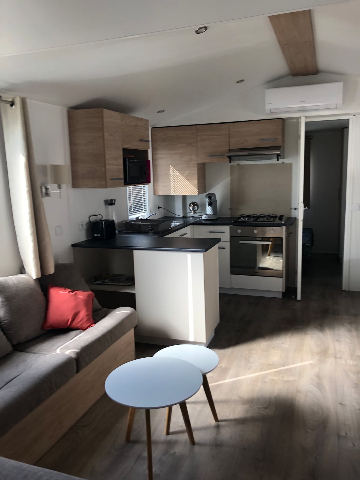 🏠 A spacious & fully equipped mobile home (44 m²) for absolute comfort! 🔹 a master suite with private bathroom & toilet 🛏️ 🔹 2 bedrooms with single beds, 2nd bathroom + separate toilet with washing machine 🚿 🔹 Large terrace: garden furniture, dining area, electric grill 🍽️ Fully equipped🔹 kitchen: dishwasher, oven, microwave, coffee maker & Senseo, kettle, toaster, stove... 🍳 Cozy living🔹 room with sofa bed and TV 📺 🔹 Air-Conditioning ❄️