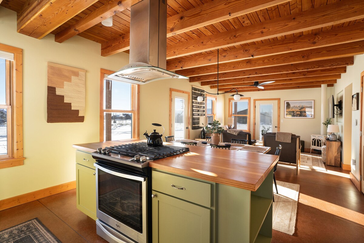 The Aspen Grove house is a modern/rustic home with a cabin feel. Nestled at the bottom of Pine Creek Pass, 4 miles west of Victor, Idaho. The neighborhood is secluded and quiet. You can walk out the front door for a beautiful view of the Grand Tetons and amber ways of grain. The home is naturally cool in the summer and cozy in the winter. The windows look out on aspen and chokecherry trees that glow red and yellow in the fall. Amenities are endless!