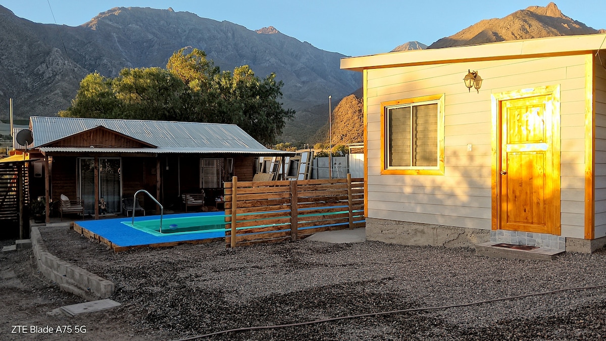 Rustic house, has a swimming pool for exclusive use and is located in a rural area 1.5 km from Vicuña (5 to 7 minutes by car). It has 2 bedrooms, one of which has a slanted window to look at the night sky. It also has a wooden hot tub, special to enjoy a bath in hot water and contemplate the starry nights of the Elqui Valley (the use of the hot tub has an additional value of $40,000 and must be booked the day before). There's a cell phone signal.