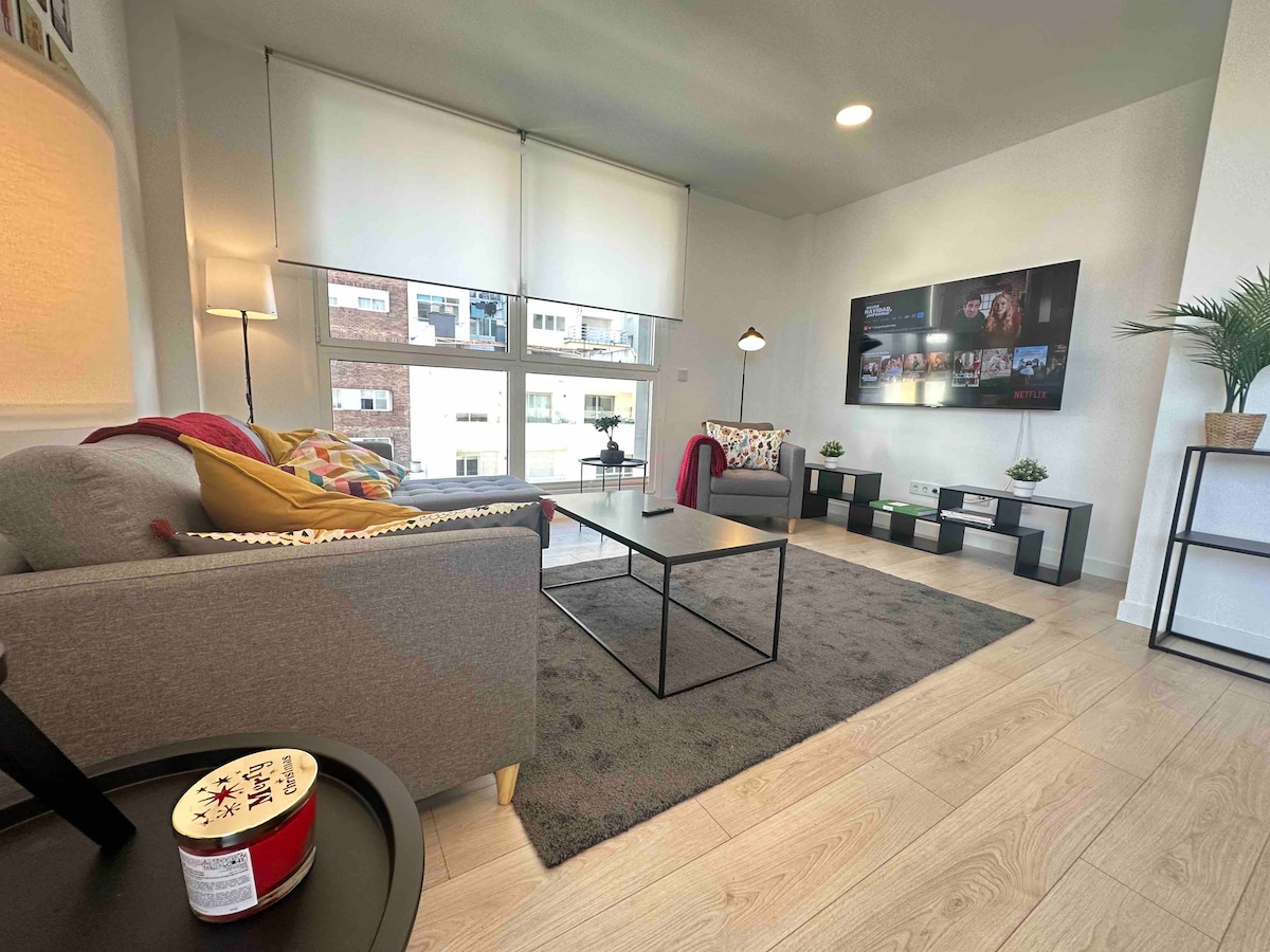 Fully equipped apartment with all the kitchenware, microwave oven, washer-dryer. Smart TV with mobile arm to adapt to personal needs. Spacious dressing room with Hangers and chest of drawers, with electric blinds on it. Very good, artificial natural lighting with dimmable LEDs in the lounge. Comfortable and spacious sofa that can be used with a bed of approximately 2.45x1.08. PVC windows with acoustic and thermal insulation.